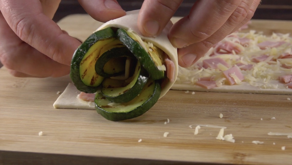 5.) Platziere nun Zucchinischeiben auf einem der Blätterteigstreifen und rolle den Teig der Länge nach ein, sodass sich eine kleine Blüte formt.