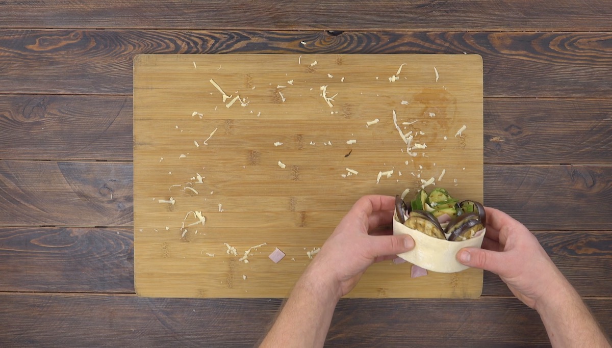 7.) Auf die letzten beiden Teigstreifen legst du nun Auberginenscheiben und wiederholst das Einrollen, bis du eine gigantische Blüte in den Händen hältst.
