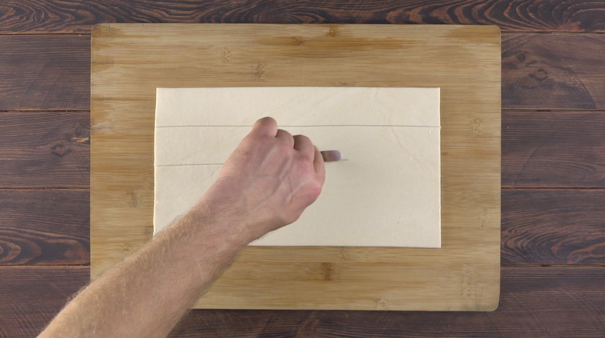 3.) Nimm einen Pizzaroller und schneide den Blätterteig in vier ca. 5 x 25 cm lange Streifen.