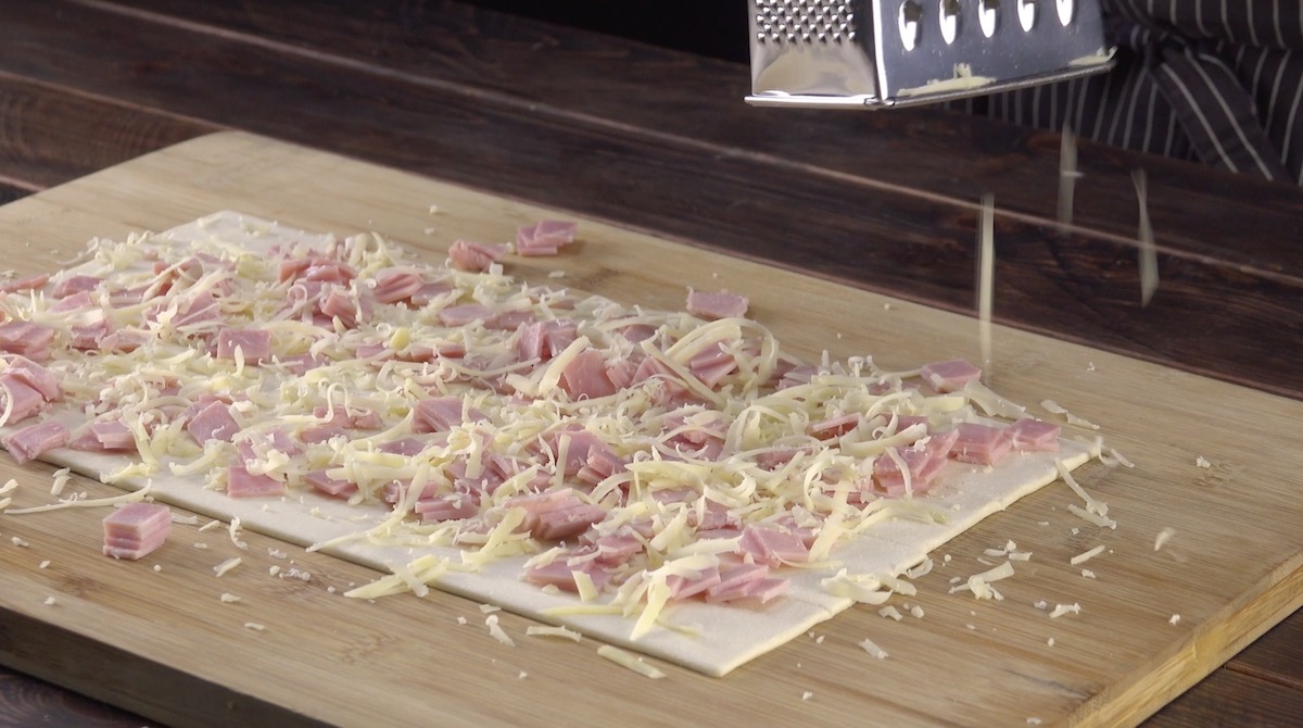 4.) Schneide den Kochschinken in kleine Quadrate und verteile diese zusammen mit dem geriebenen Käse auf den vier Blätterteigstreifen.