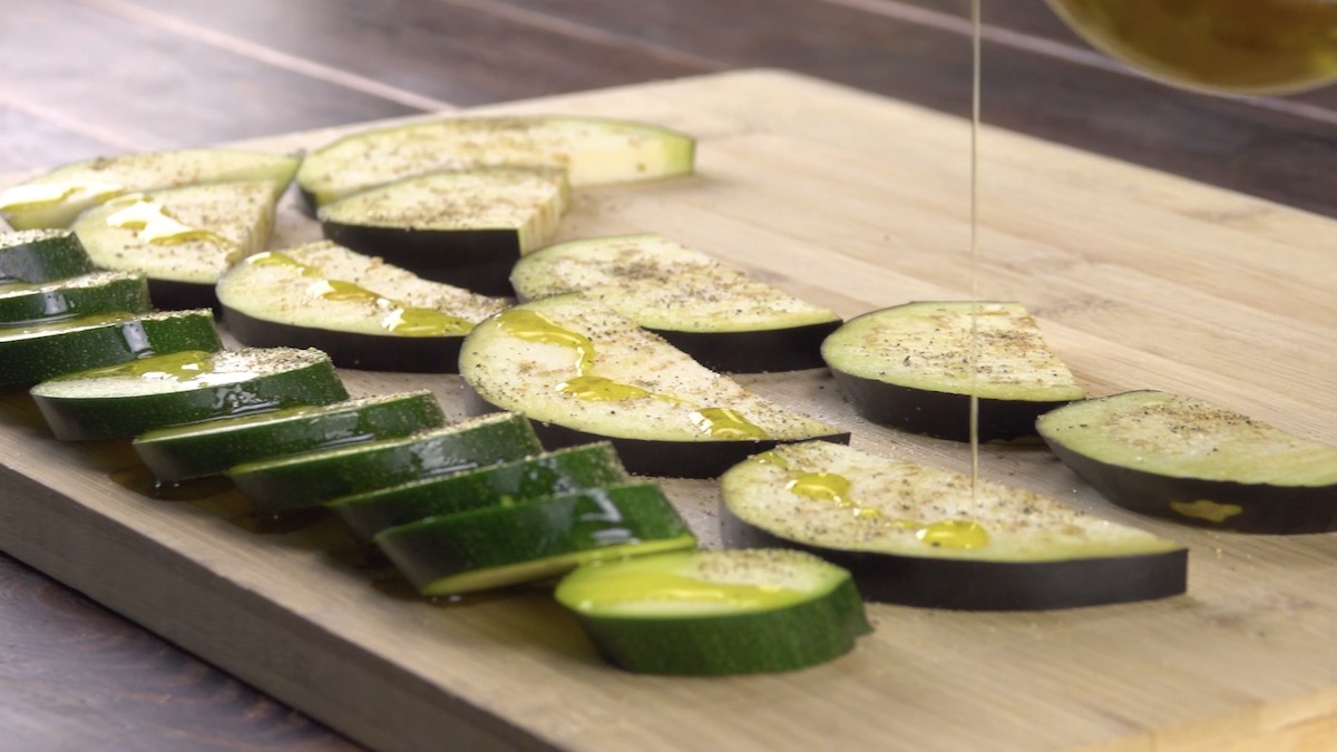 1.) Schneide eine halbe Zucchini sowie eine halbe Aubergine in Scheiben und halbiere die Auberginenscheiben.