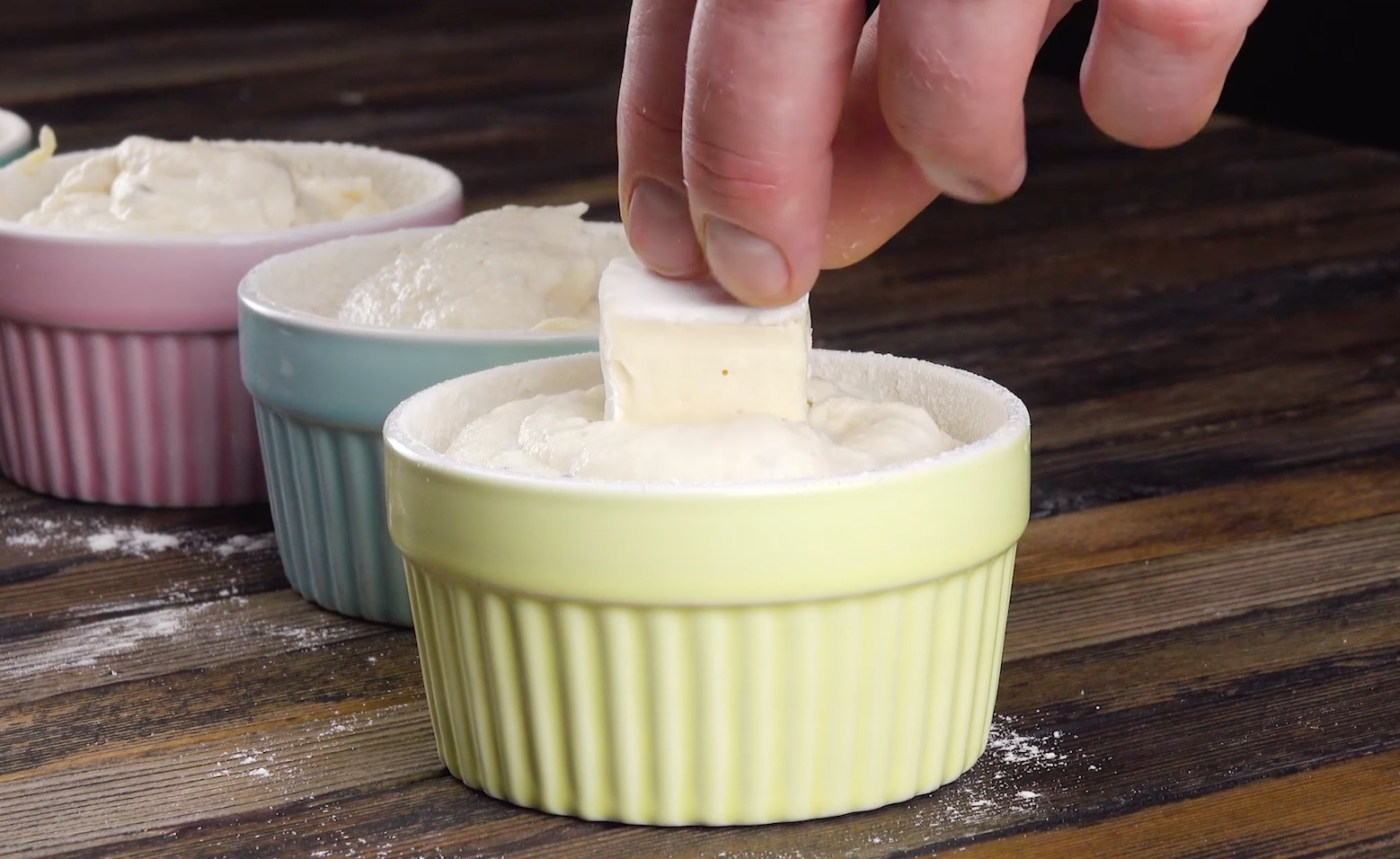 3.) Fette dann etwa vier kleine feuerfeste Förmchen mit Butter ein und schwenke dann etwas Mehl darin, das an der Butter haften bleiben sollte. Fülle die Förmchen dann mit der Creme und drücke in jedes mittig ein Stück Brie.