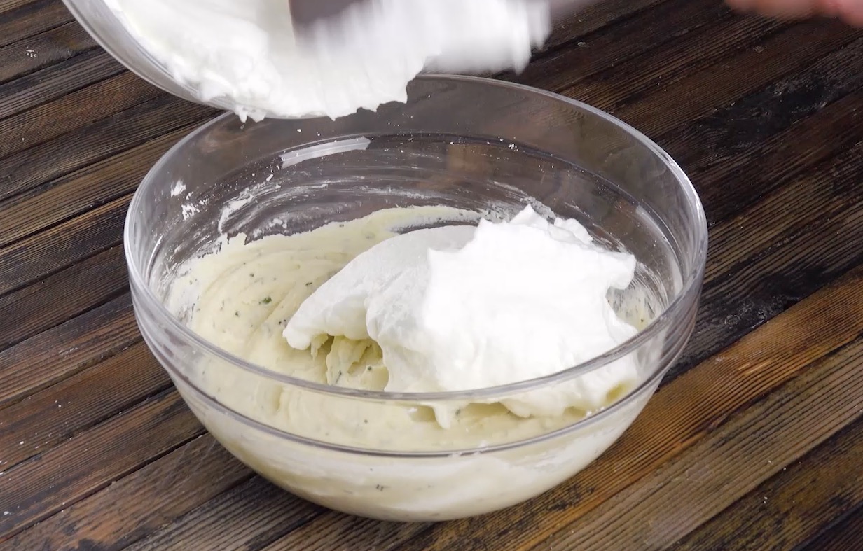 2.) Fülle die Creme in eine Schüssel und gib Rosmarin und das Stärkemehl hinzu. Schlage dann das Eiweiß in einer separaten Schüssel steif und rühre es mit einem Schneebesen unter die Kohlcreme.