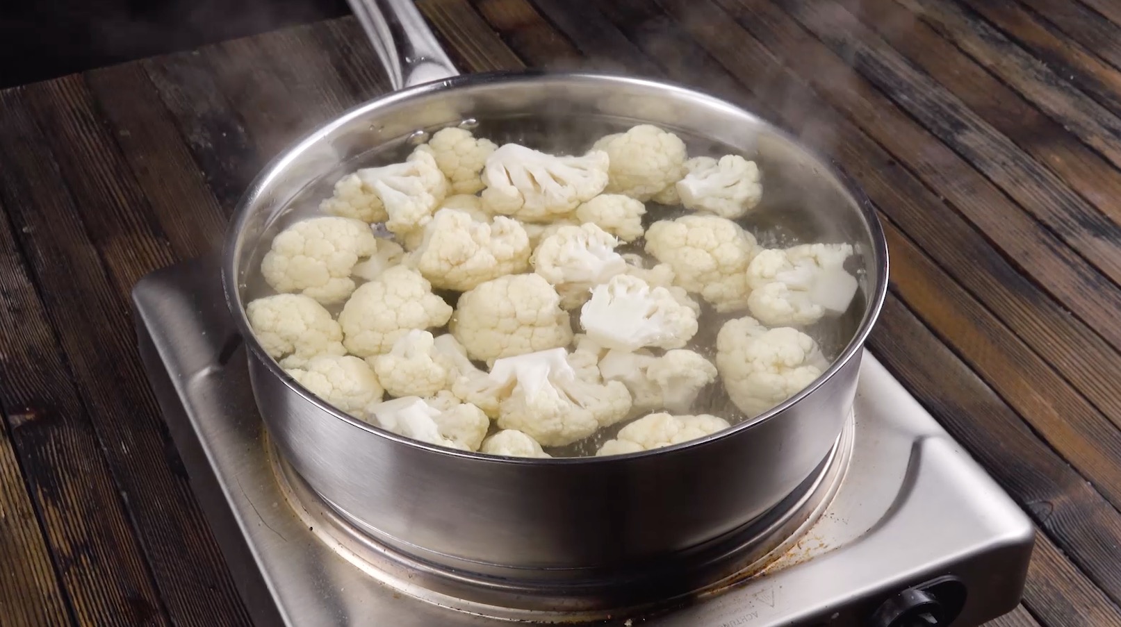 1.) Zerteile zunächst den Blumenkohl in Röschen (z.B. mit einem Küchenspachtel) und koche ihn dann in Salzwasser weich. Lass ihn danach in einem Sieb abtropfen und auskühlen.