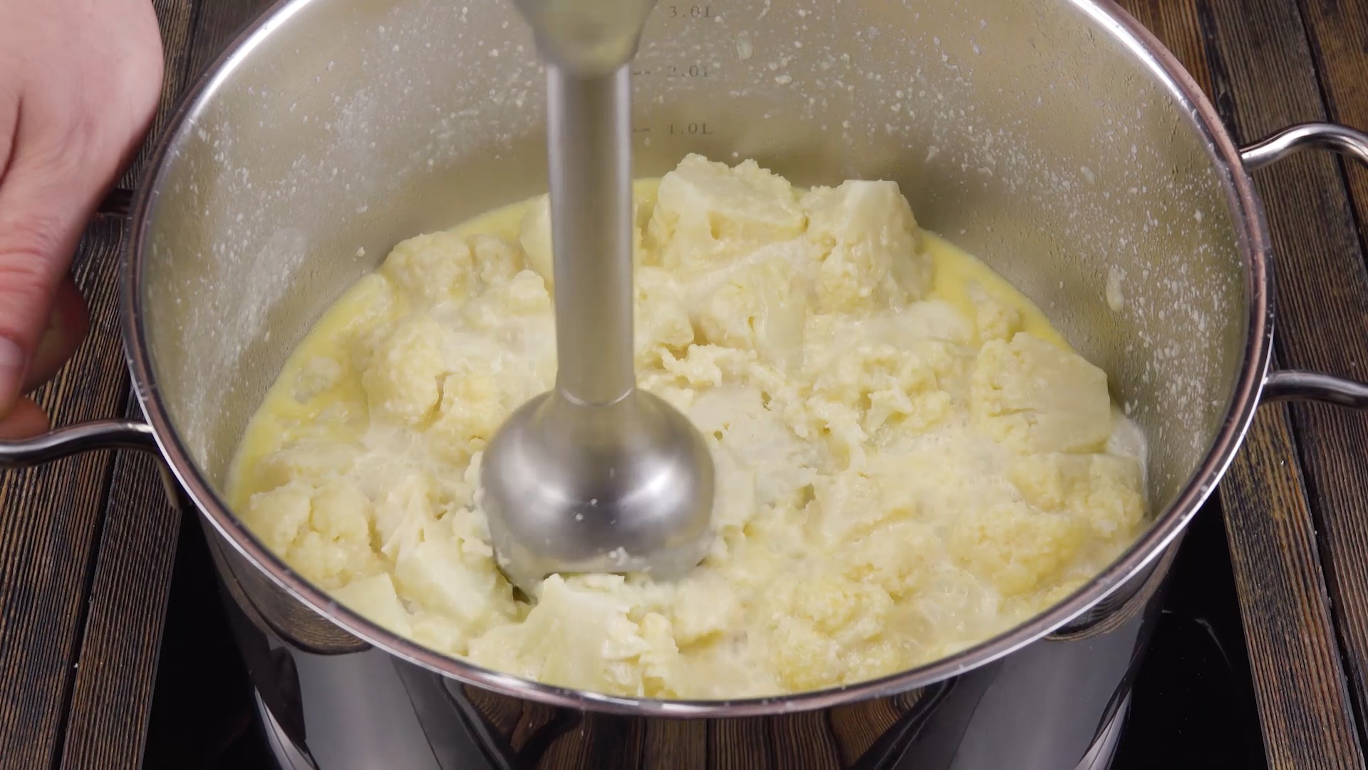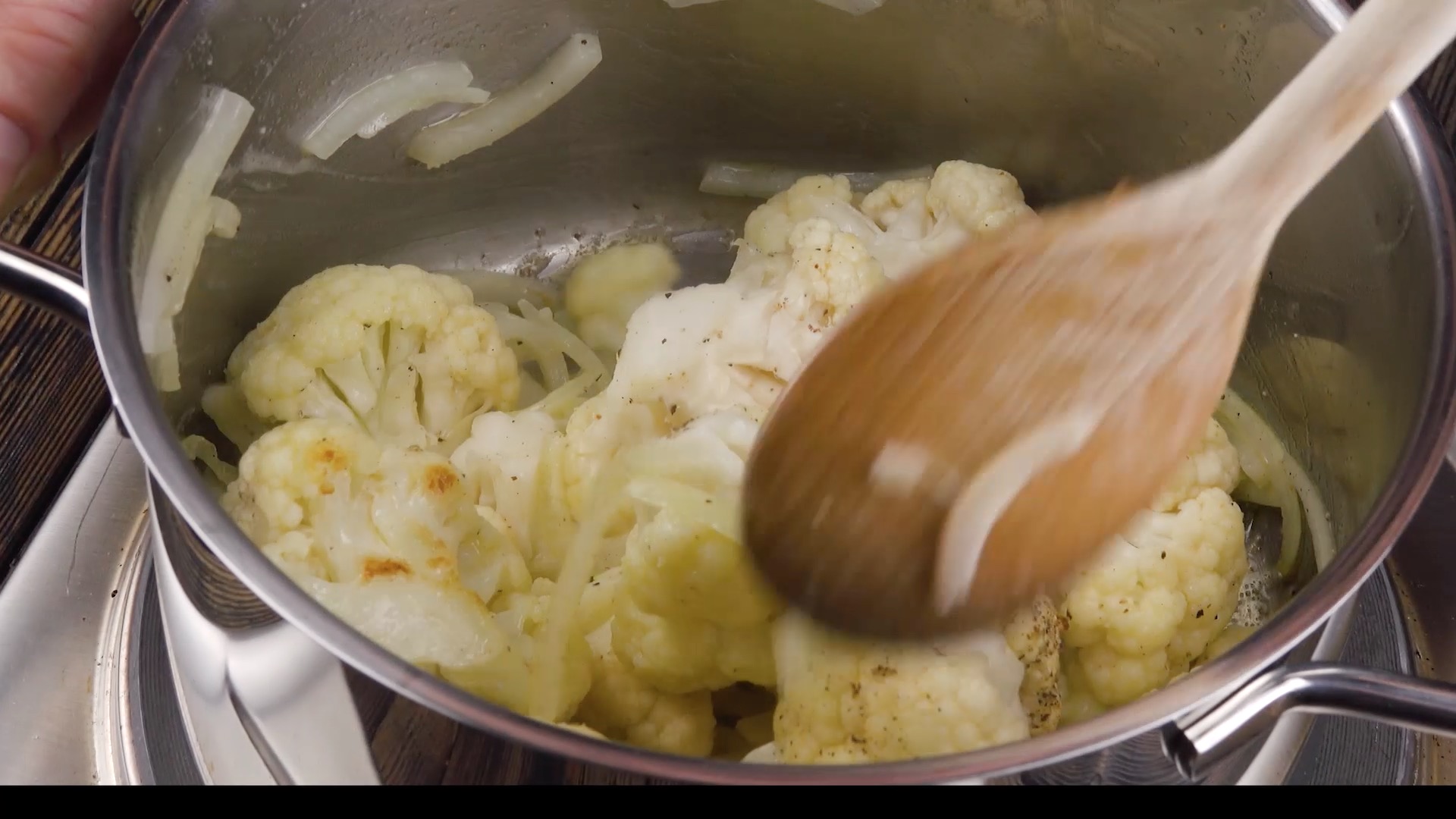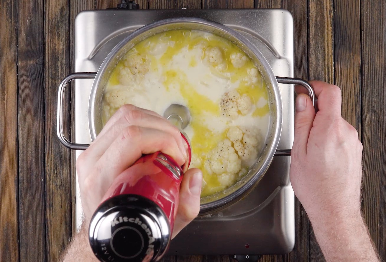 1.) Lass zunächst den Blumenkohl mit den Zwiebeln in der zerlassenen Butter anschwitzen und würze ihn mit Salz, Pfeffer, etwas Muskatnuss und Zucker. Lösche das Ganze mit der Brühe und der Sahne ab und lass die Mischung mit Deckel köcheln, bis der Blumenkohl weich ist.