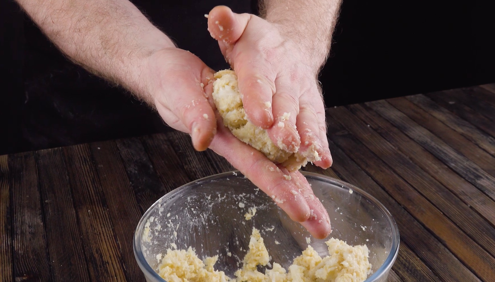 2.) Lege den Kohl in eine Schüssel und gib den Rest Käse, die Zwiebel, das Ei, Salz und Pfeffer sowie die Semmelbrösel hinzu. Zerdrücke den Blumenkohl mit einer Gabel und mische alle Zutaten sorgfältig.