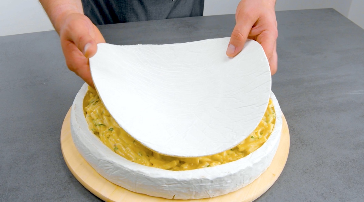 5. Fülle die Käsenudeln in den ausgehöhlten Brie und verschließe ihn mit dem Käsedeckel.