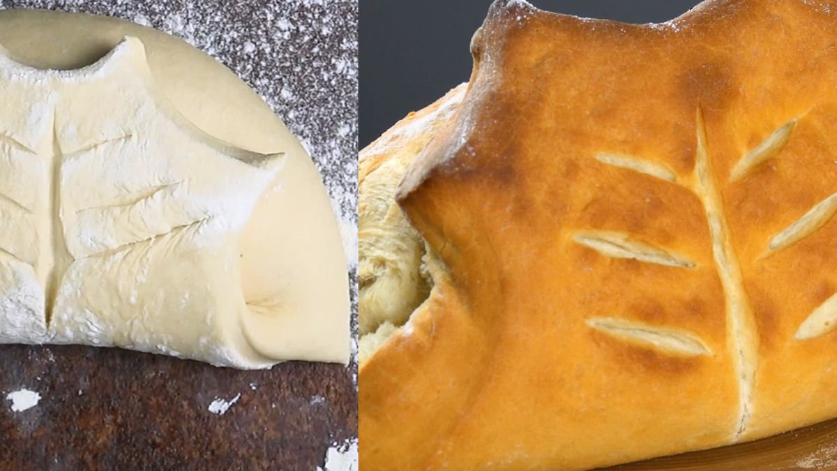 4.2) Klappe diese Teighälfte dann auf die unausgerollte Hälfte nach oben um. Schneide mit einem scharfen Messer die Blattadern in den Teig.