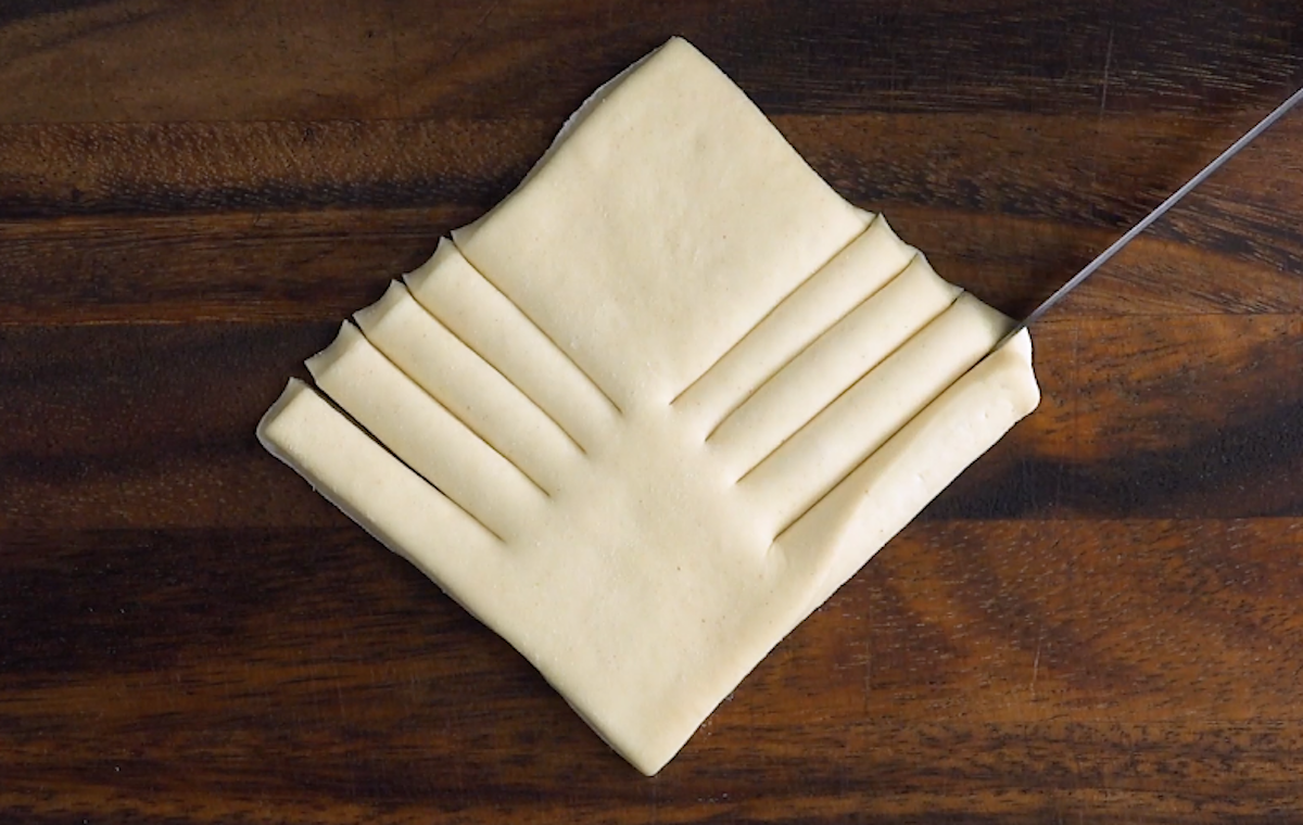 7.1) Schneide aus dem ausgerollten Teig ein Quadrat von 10 mal 10 cm aus. Schneide den Teig vier Mal auf beiden Seiten ein, wie im folgenden Bild zu sehen.