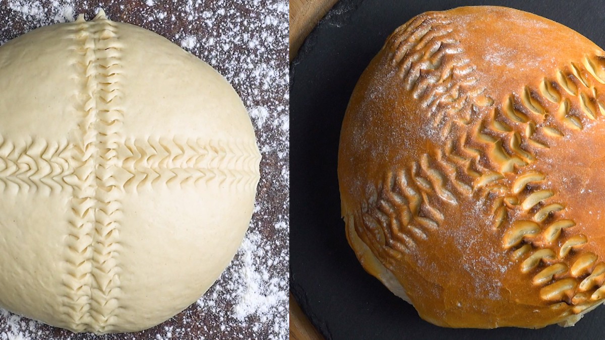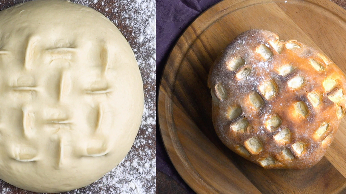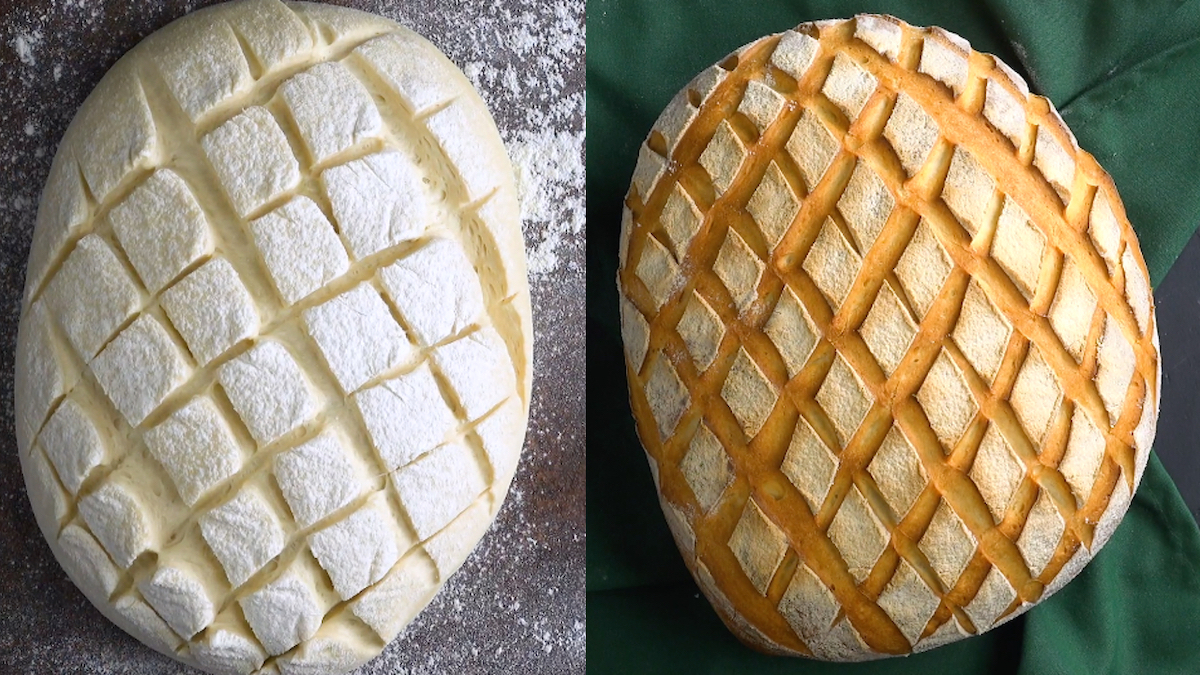 Forme den Teig oval und bestäube ihn mit Mehl. Lasse ihn dann 30 Minuten gehen. Ritze den Laib mit einem scharfen Messer diagonal von links nach rechts und von rechts nach links ein. So entsteht das Karo-Muster. Schiebe das Brot in den vorgeheizten Ofen und backe es bei 250 °C Ober- und Unterhitze 15 Minuten an. Reduziere dann die Temperatur auf 180 °C und backe das Brot für weitere 30 Minuten. Mache am Ende den Klopftest – das Brot sollte hohl klingen.