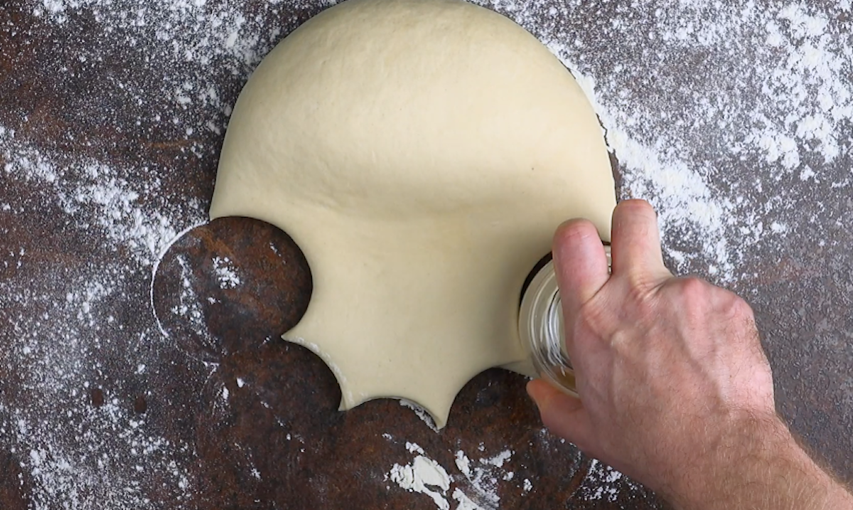 4.1) Forme den Teig zu einer Kugel und rolle ihn von der Mitte aus mit einem Nudelholz nach unten aus. Stich die ausgerollte Teigfläche mit einem Glas so aus, dass eine Blatt-Form entsteht.