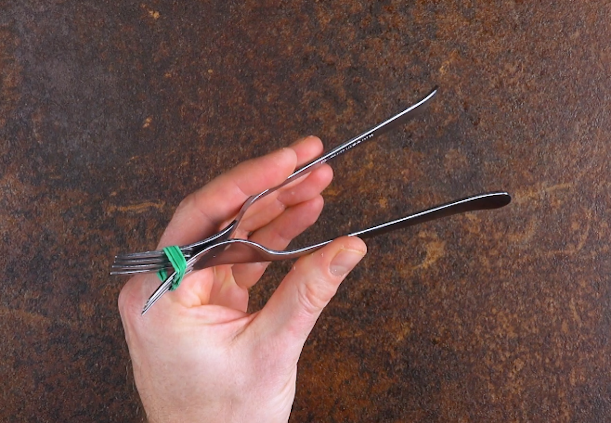 1.1) Forme den Teig zu einer Kugel. Drücke diese dann etwas platt. Bestäube zwei Gabeln mit Mehl und befestige sie mit einem Gummi aneinander, wie in folgendem Bild zu sehen.