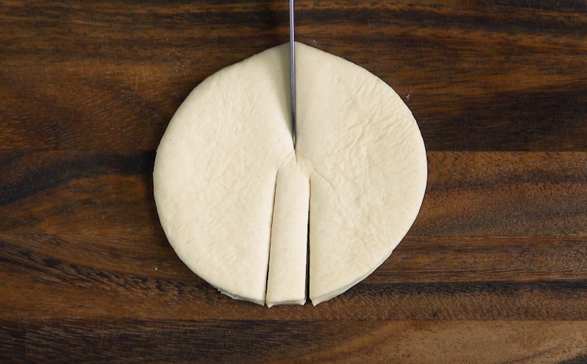 10.1) Stich aus dem ausgerollten Teig einen Kreis von ca. 13 cm Durchmesser aus. Schneide den Kreis so ein, dass 4 gleich große Segmente zu sehen sind.