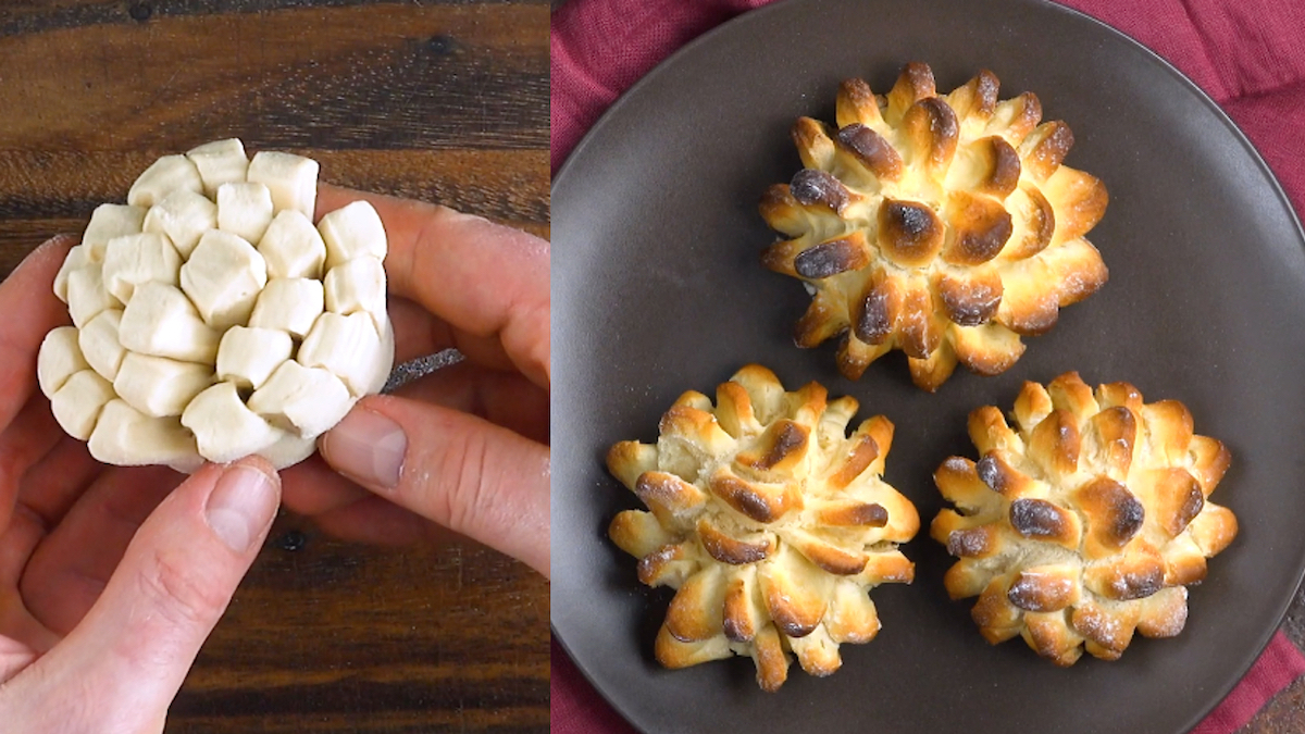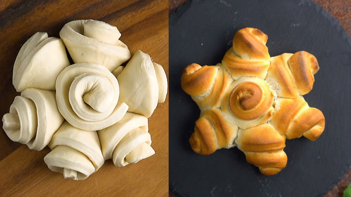 10.2) Platziere in die Mitte dann eine Teigkugel. Klappe die Segmente nach oben, sodass der Teig wie eine Rose aussieht. Schiebe die Rose bei 250 °C Ober- und Unterhitze für 15 Minuten in den Ofen. Drehe die Ofentemperatur dann auf 180 °C herunter und backe die Rose noch ca. 20 Minuten.