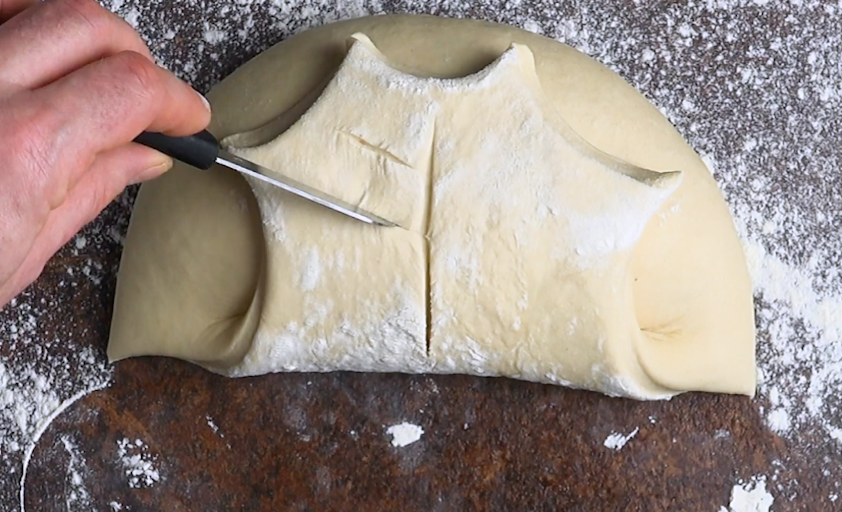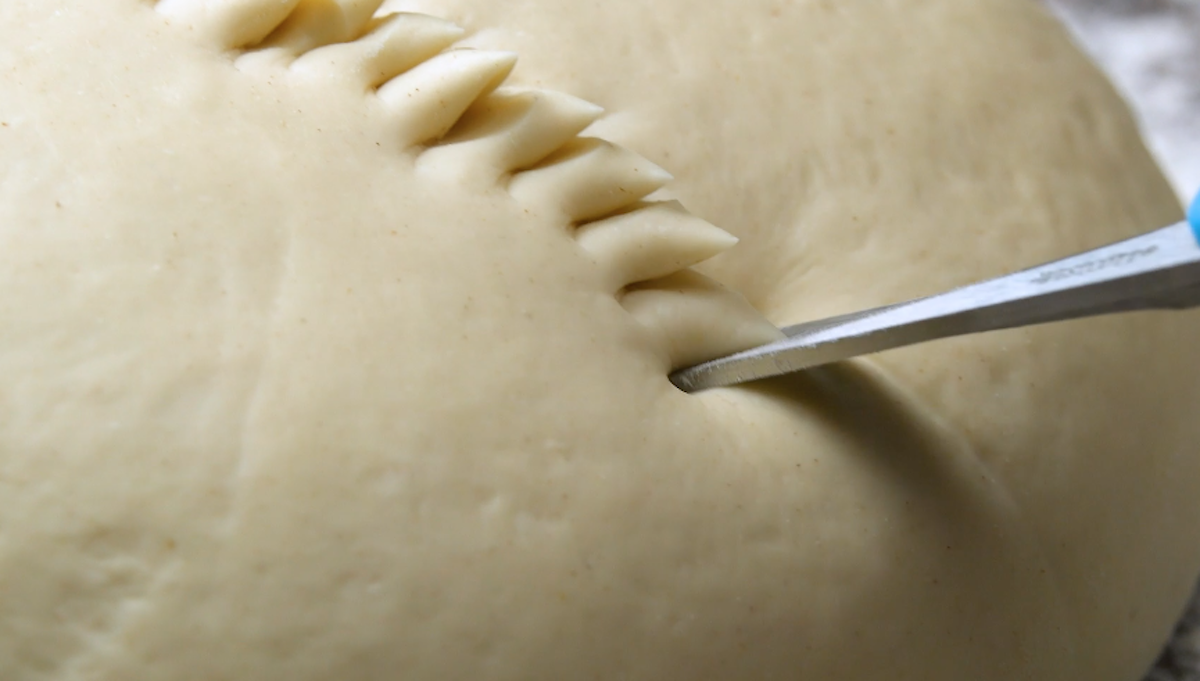 2.2) Schneide dann den Teig sowohl längs als auch quer links und rechts entlang der Linie mit einer Schere ein.