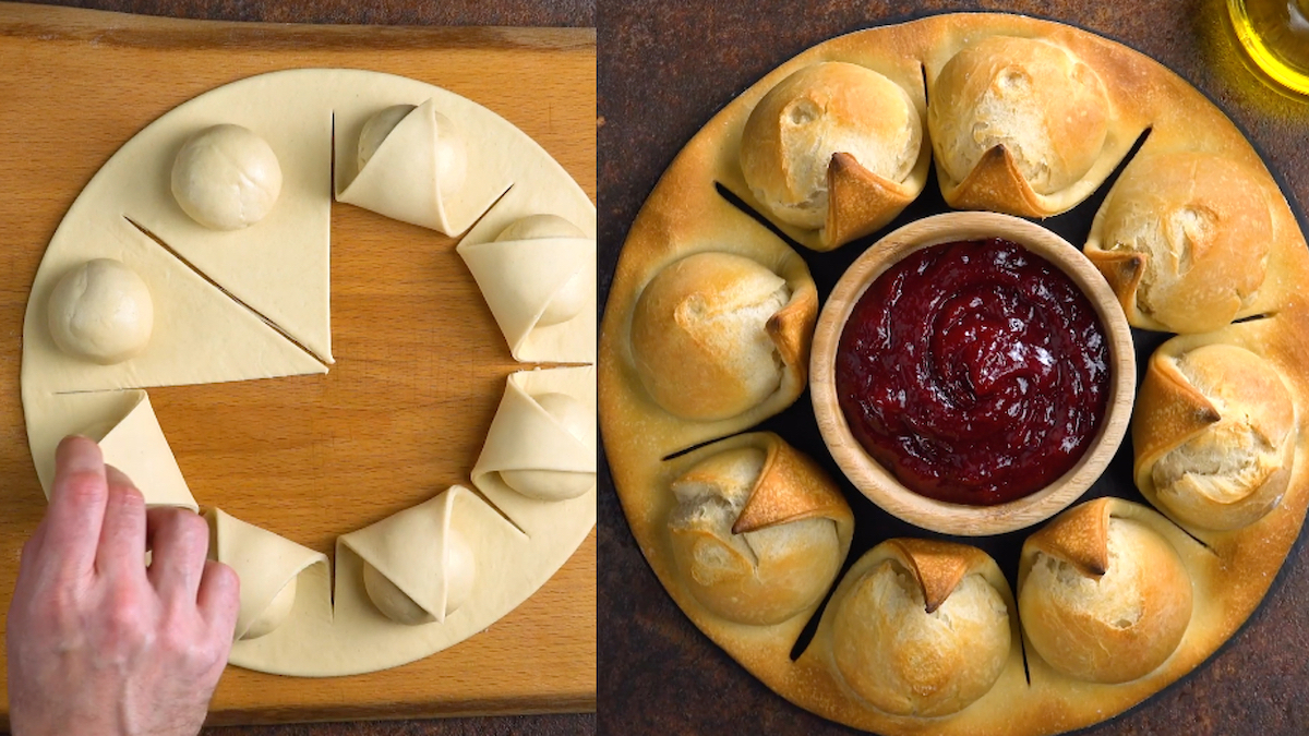 12.2) Setze 8 Teigkugeln an den Rand und klappe die Spitzen von innen nach außen auf die Kugeln. Backe den Kranz 15 Minuten bei 250 °C Ober- und Unterhitze im vorgeheizten Backofen. Reduziere dann die Temperatur auf 180 °C und backe den Kranz weitere 30 Minuten.