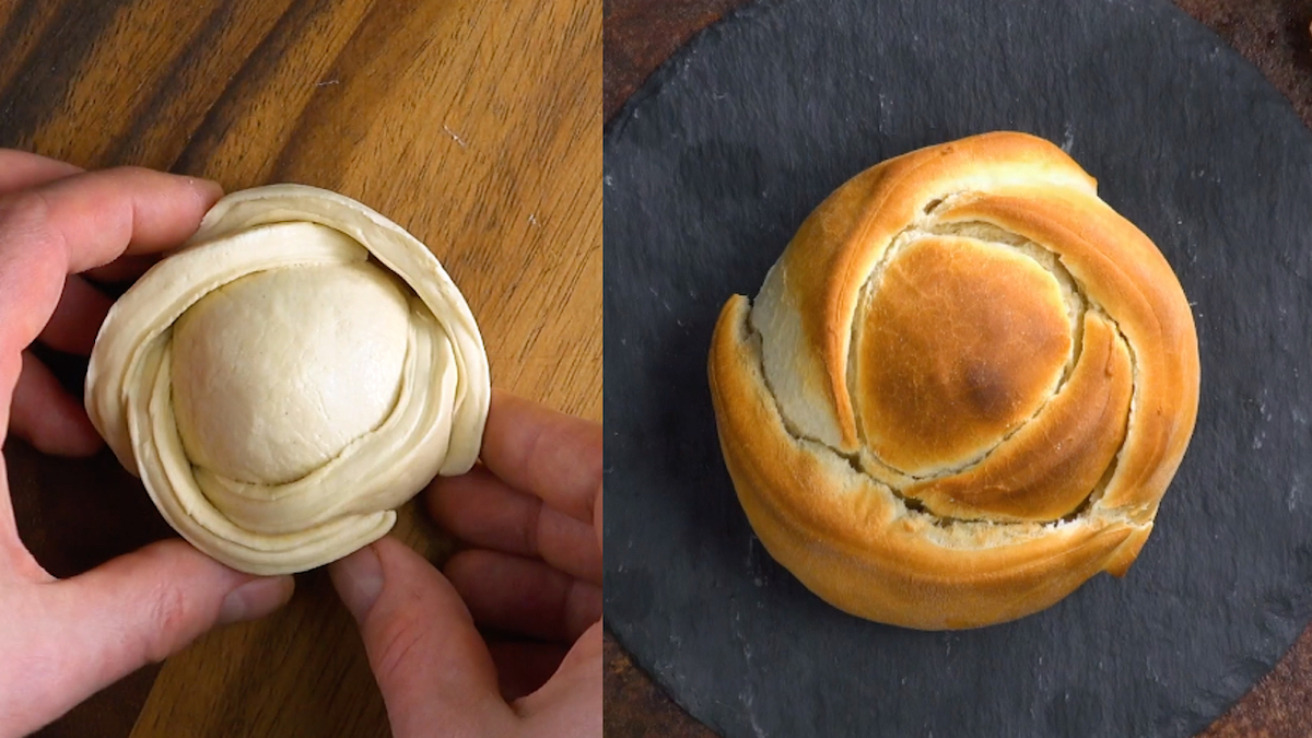 Forme den Teig zu einer Kugel und schneide sie mit einem Pizzaschneider oder mit einem kleinen Messer spiralförmig ein. Am besten nimmst du dafür einen Drehteller zu Hilfe. Schiebe das Brot bei 250 °C in den vorgeheizten Backofen und backe es für 15 Minuten an. Drehe die Gradzahl dann auf 180 °C herunter und backe das Brot weitere 30 Minuten. Mache am Ende den Klopftest – das Brot sollte hohl klingen.