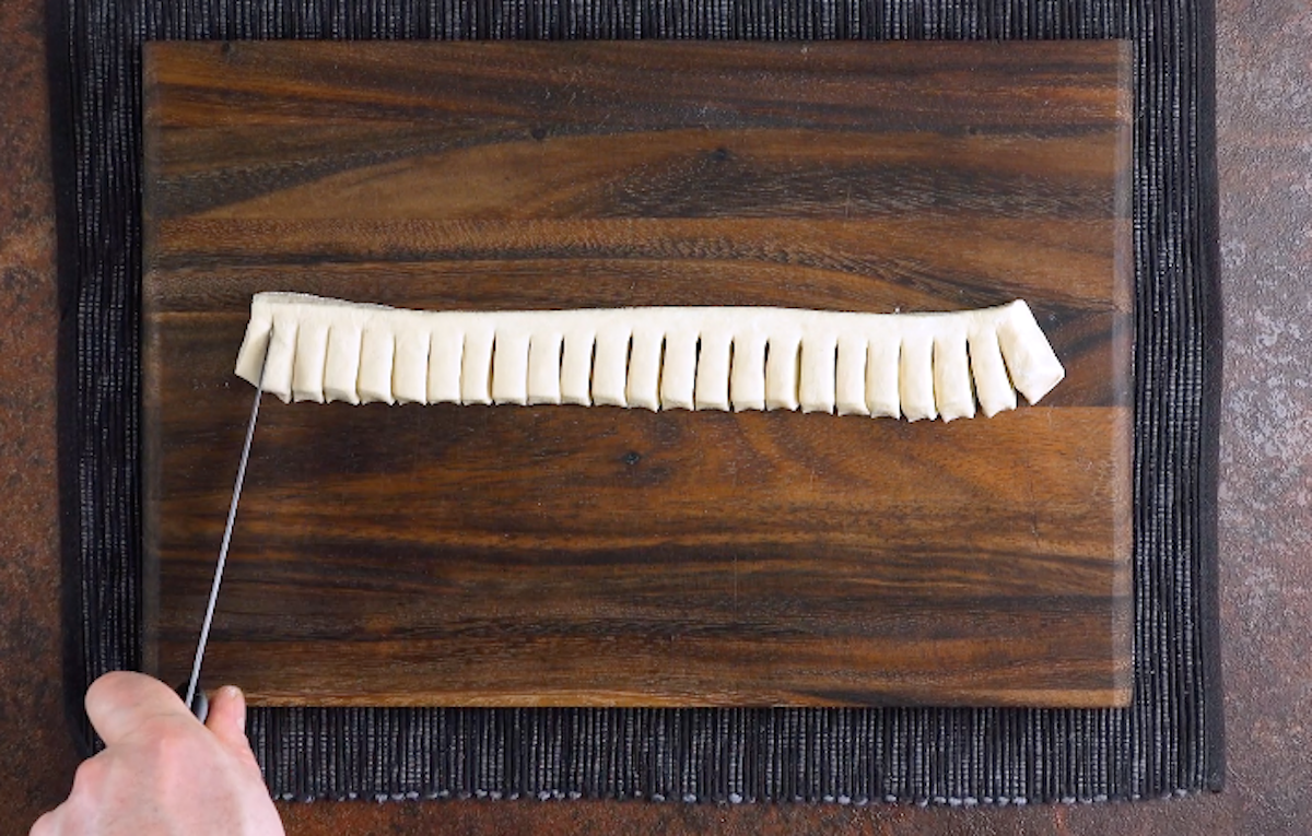 9.1) Schneide einen Teigstreifen zurecht (Länge 20 cm, Höhe 2 cm). Schneide den Streifen in regelmäßigen Abständen mit einem Messer ein.