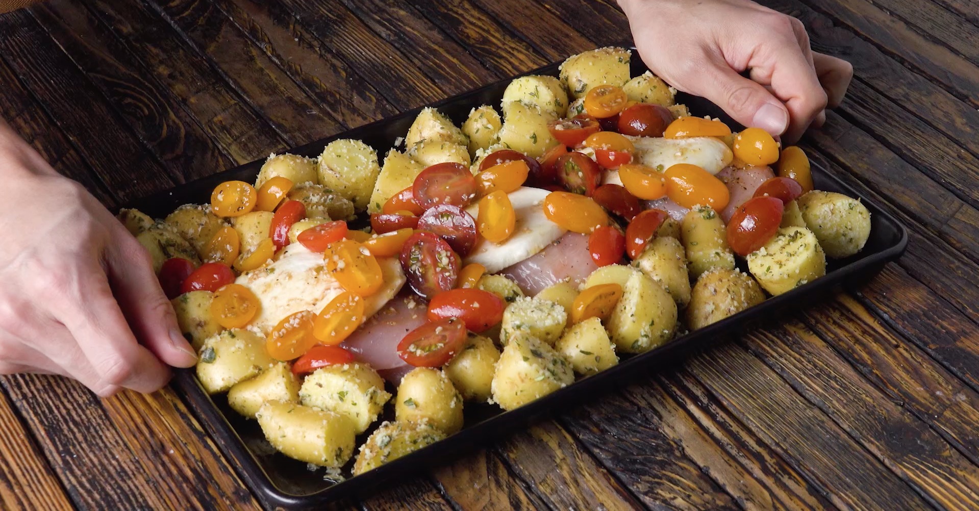 4.) Nun kommt das Blech in den Ofen. Backe das Ganze für 25 Minuten bei 200 °C im Umluftmodus. Tipp: Löse alle Zutaten vorsichtig vom Blech und richte sie auf einer Servierplatte an. Als Verzierung kannst du noch frisches Basilikum um das Gericht herum auf dem Rand der Platte drapieren.