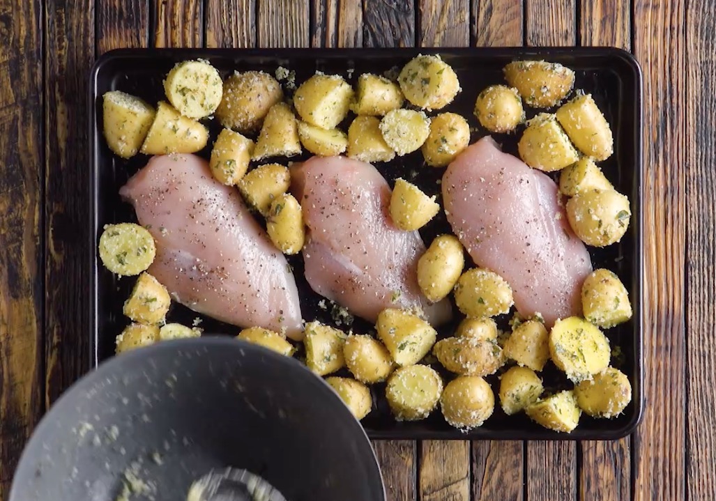 2.) Schneide die Kartoffeln in etwa gleich große Stücke, gib sie in eine Schüssel und gieße das Olivenöl darauf. Danach kommen alle Gewürze und der Käse dazu und alles wird sorgfältig vermischt. Gib danach alles zum Hühnchen auf das Blech.