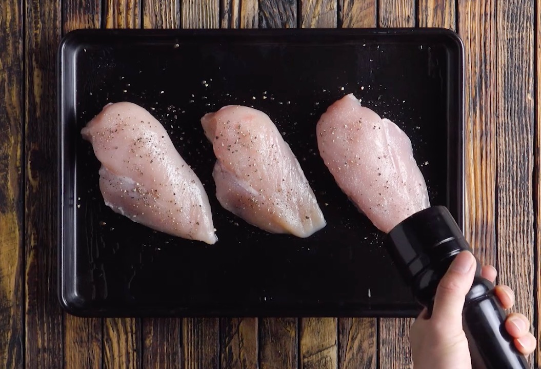So geht es: 1.) Bestreiche zunächst ein tiefes Backblech mit dem Öl, lege dann die Hühnerbrüste darauf und würze sie nach Belieben mit Salz und Pfeffer.