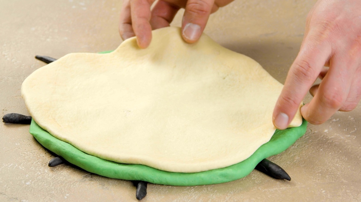 11. Rolle auch den ungefärbten Teig rund aus und lege ihn auf den grünen; streiche diesen zuvor mit etwas Wasser ein.