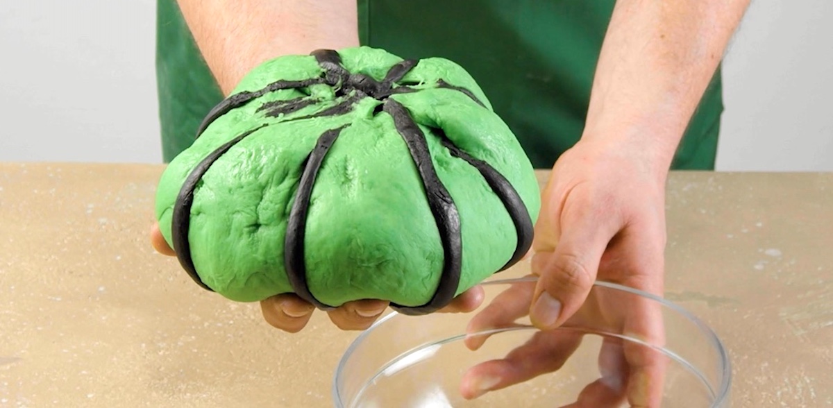 13. Klappe auch den restlichen Teig über der Kugel zusammen und drücke die Ränder vorsichtig fest; achte jedoch darauf, dass sich die Teigfarben nicht miteinander vermischen.