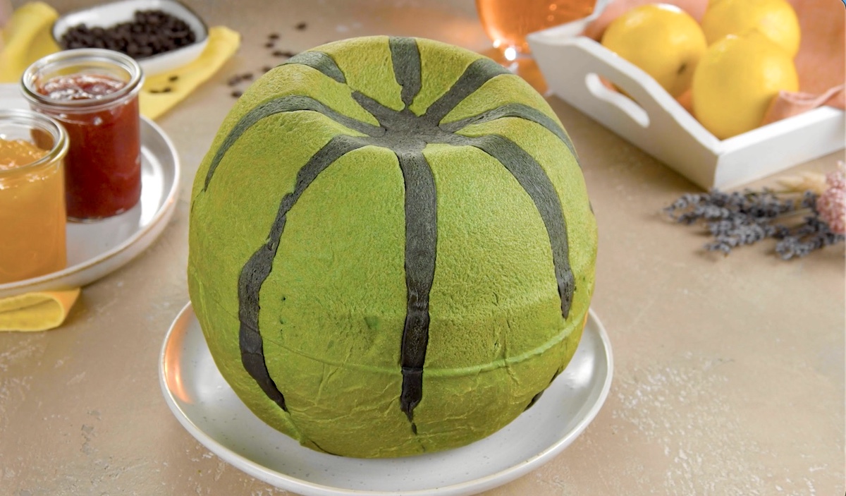 Lass den Kuchen nach dem Backen abkühlen und löse ihn dann vorsichtig aus den beiden Schalen – schon jetzt sieht er einer Wassermelone zum Verwechseln ähnlich!