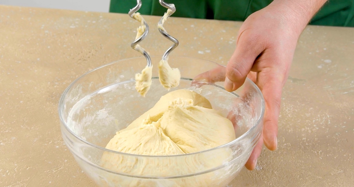 2. Verknete Mehl, Zucker und Hefe mit der abgekühlten Milchcreme zu einem glatten Teig.
