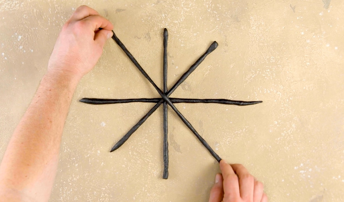 9. Rolle den schwarzen Teig zu einer langen, dünnen Rolle aus und schneide diese in vier gleich lange Stücke. Lege diese dann sternförmig übereinander.
