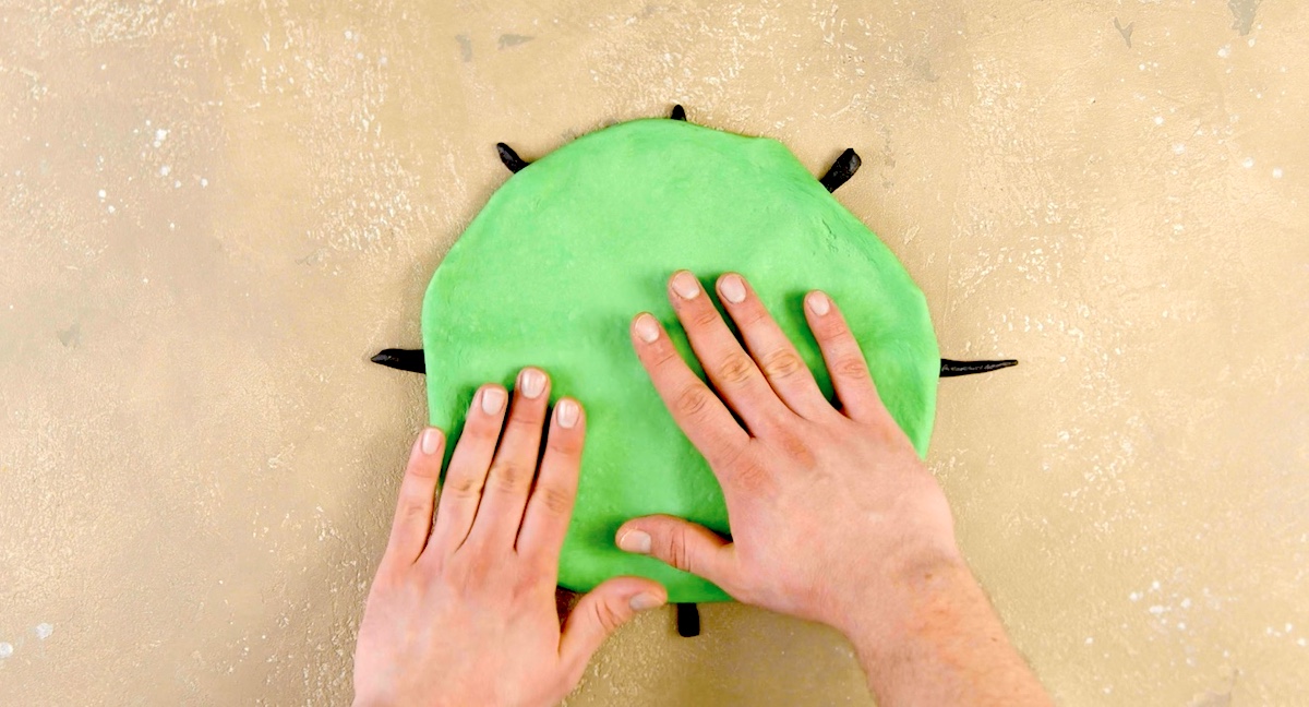 10. Rolle den grünen Teig rund aus und lege ihn mittig auf den schwarzen Teigstern.