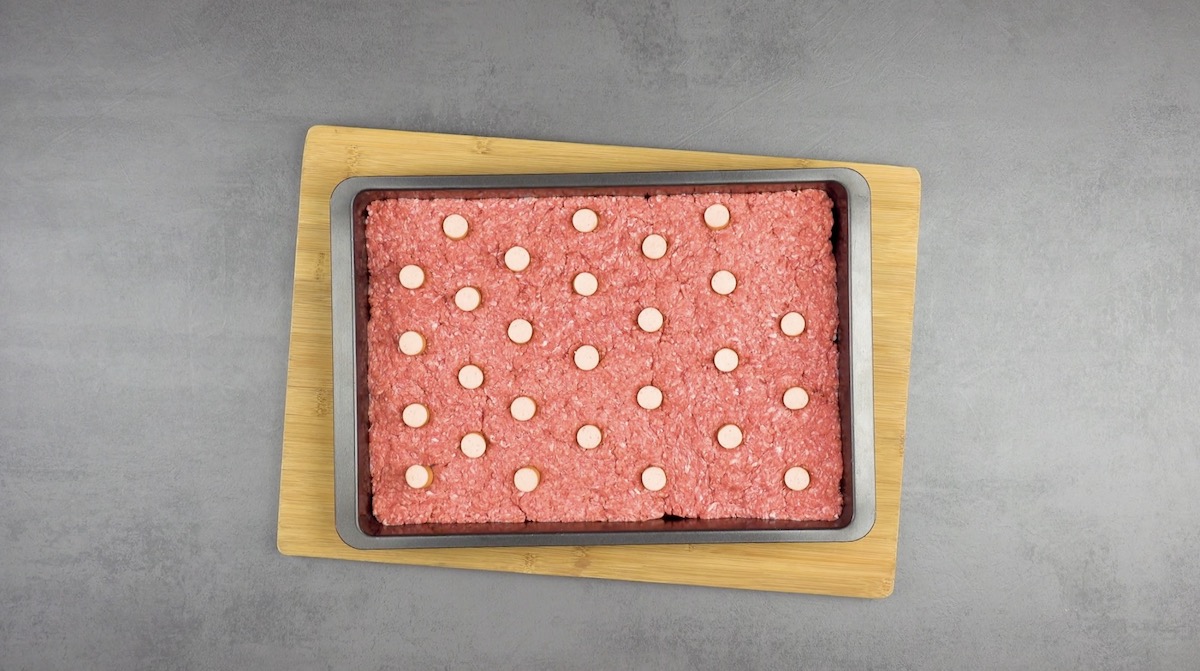4.) Vermenge das Hackfleisch mit Salz, Pfeffer und Knoblauchpulver. Gib es dann auf ein eingefettetes Backblech und achte darauf, dass es etwas kleiner ist als das Blech für die Pizza. Schneide anschließend die Wiener in Stücke und verteile sie auf dem Hackfleisch. Backe das Ganze für 6 Minuten bei 200 °C im Grillmodus.