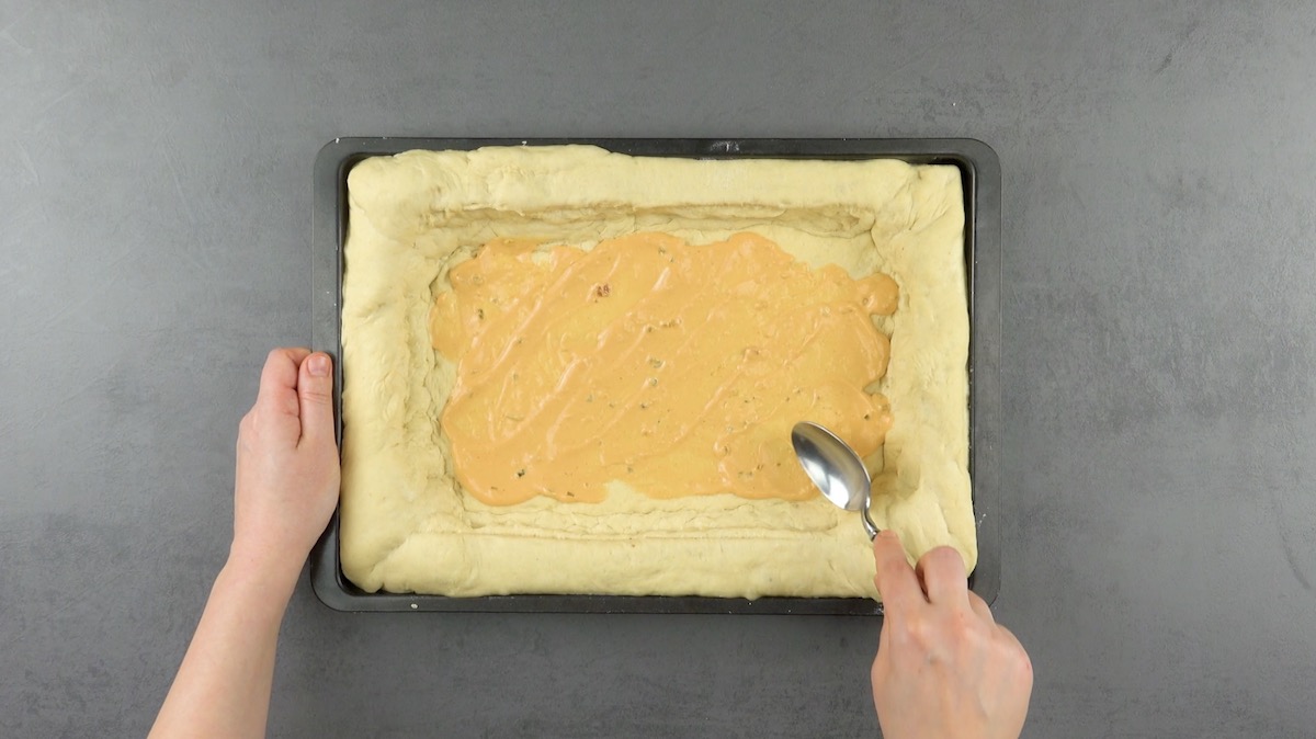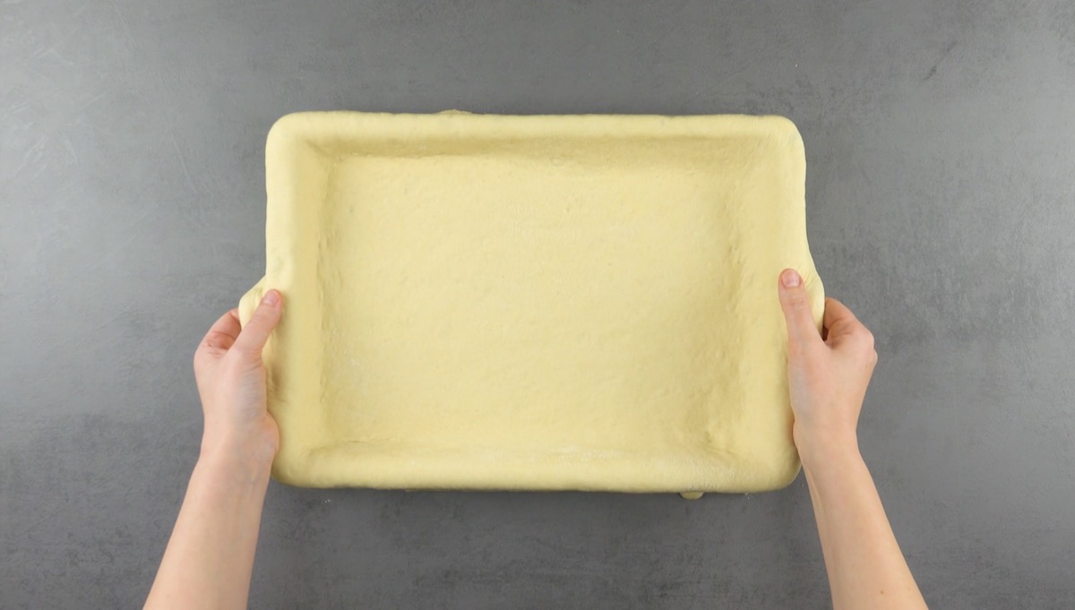 Rolle den Pizzateig dann großzügig aus und lege ihn so in ein eingefettetes tiefes Backblech, dass die Enden den Rand überlappen.