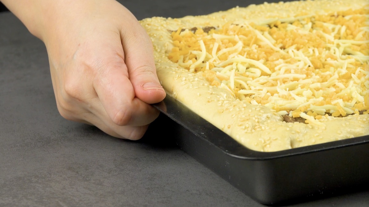 6.) Verteile den geriebenen Käse auf dem Fleisch. Verquirle das Ei, bestreiche damit den Rand der Pizza und verteile Sesam darüber. Backe die Pizza für 20 Minuten bei 200 °C Umluft.
