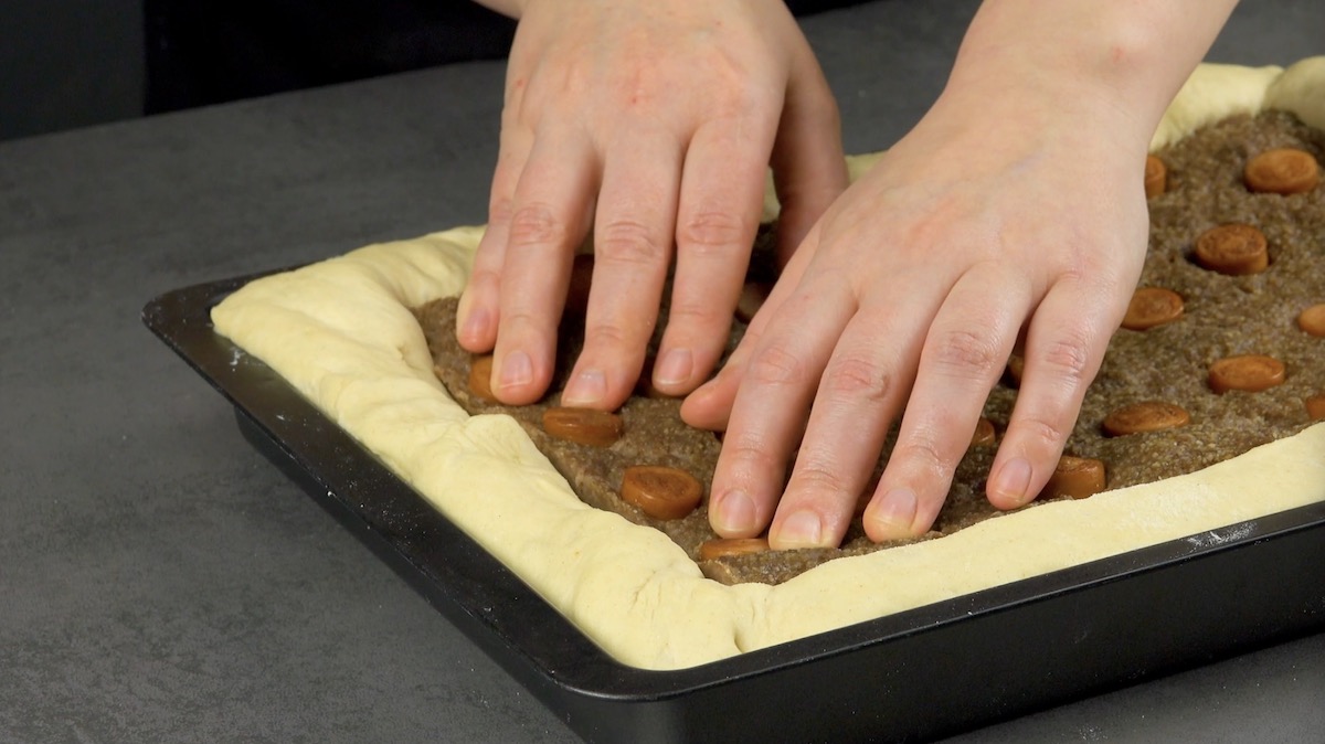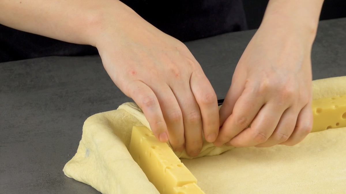 2.) Schneide den Emmentaler in dicke Scheiben und lege diese auf den Pizzateig, am Rand des Blechs entlang. Schlage den überlappenden Teig dann so um, dass die Käsescheiben darunter verborgen sind.