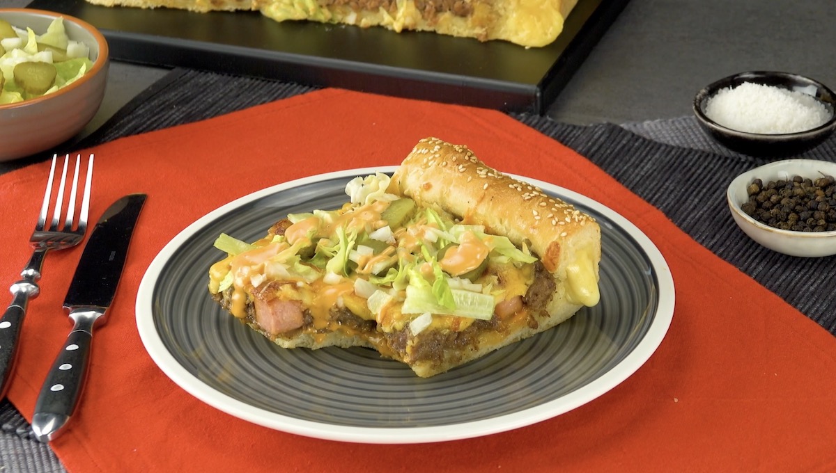 Hast du mal wieder Lust auf Pizza? Oder darf es doch lieber ein deftiger Burger sein? Wenn du dich nicht entscheiden kannst, wie wäre es dann mit einer Kombination aus beidem? Unsere Burger-Pizza hat nämlich so einiges in petto: geschmolzenen Käse, XXL-Burger-Patty und leckere Soße!