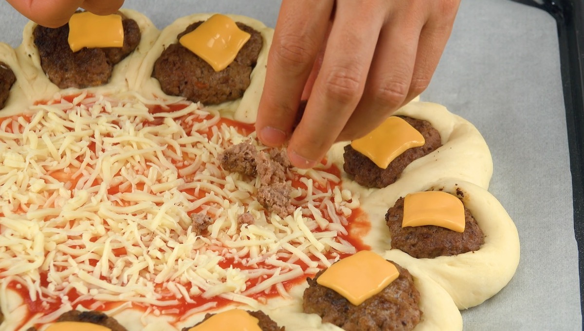 5.) Verteile kleine Cheddarscheiben auf den Hackbällchen. Streiche dann Tomatensauce in die Mitte der „Hackblume“ und streue geriebenen Käse darüber. Rupfe das übrig gebliebene Hackbällchen klein und verteile es auf dem verstreuten Käse. Schiebe die Burger-Pizza bei 200 °C Ober- und Unterhitze für etwa 14 Minuten in den Ofen.