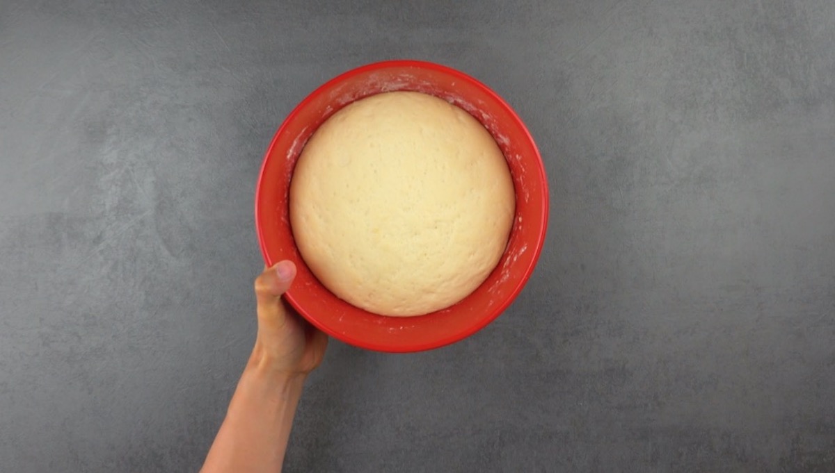 1.) Als Erstes bereitest du den Hefeteig zu. Gib dafür Mehl in eine Schüssel und bilde in der Mitte eine kleine Kuhle. Gib Zucker und Hefe in die Kuhle und gieße das lauwarme Wasser dazu. Verknete alles miteinander und gib währenddessen Öl und Salz hinzu. Knete die Masse so lange, bis ein glatter Teig entstanden ist, der nicht mehr an den Händen klebt. Wenn der Teig immer noch zu sehr klebt, gib einfach noch ein bisschen Mehl hinzu. Forme den Teig zu einer Kugel, lege ihn in eine Schüssel und decke ihn mit einem feuchten Tuch ab. Lasse ihn an einem warmen Ort gehen.