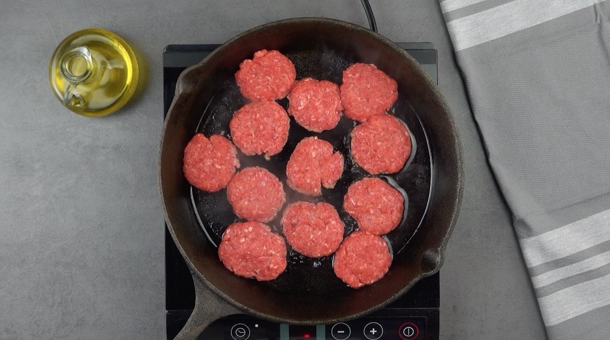 3.) Für die Fleischbällchen würzt du das Hackfleisch mit Salz und Pfeffer und vermischst alles gut miteinander. Trenne wieder etwa 120 g von dem Fleisch ab und brate es einzeln von beiden Seiten an. Das restliche Hackfleisch wird in kleine Kugeln (ca. 40 g) portioniert, hierbei kann ein Eislöffel sehr hilfreich sein. Brate die Fleischbällchen von beiden Seiten an, drücke sie dabei etwas platt.