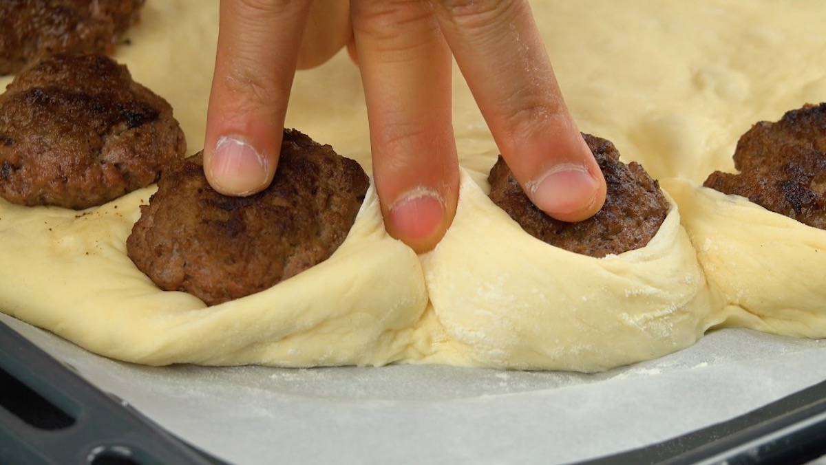 4.) Rolle nun den restlichen Teig aus Punkt 2 auf einem mit Packpapier ausgelegten Backblech rund aus. Lege die fertig gebratenen Hackbällchen – bis auf eines – rundherum an den Rand des Teiges und ziehe den Teig zwischen zwei Bällchen immer ein bisschen ins Innere. Das verbleibende Hackbällchen wird im nächsten Schritt gesondert benötigt.