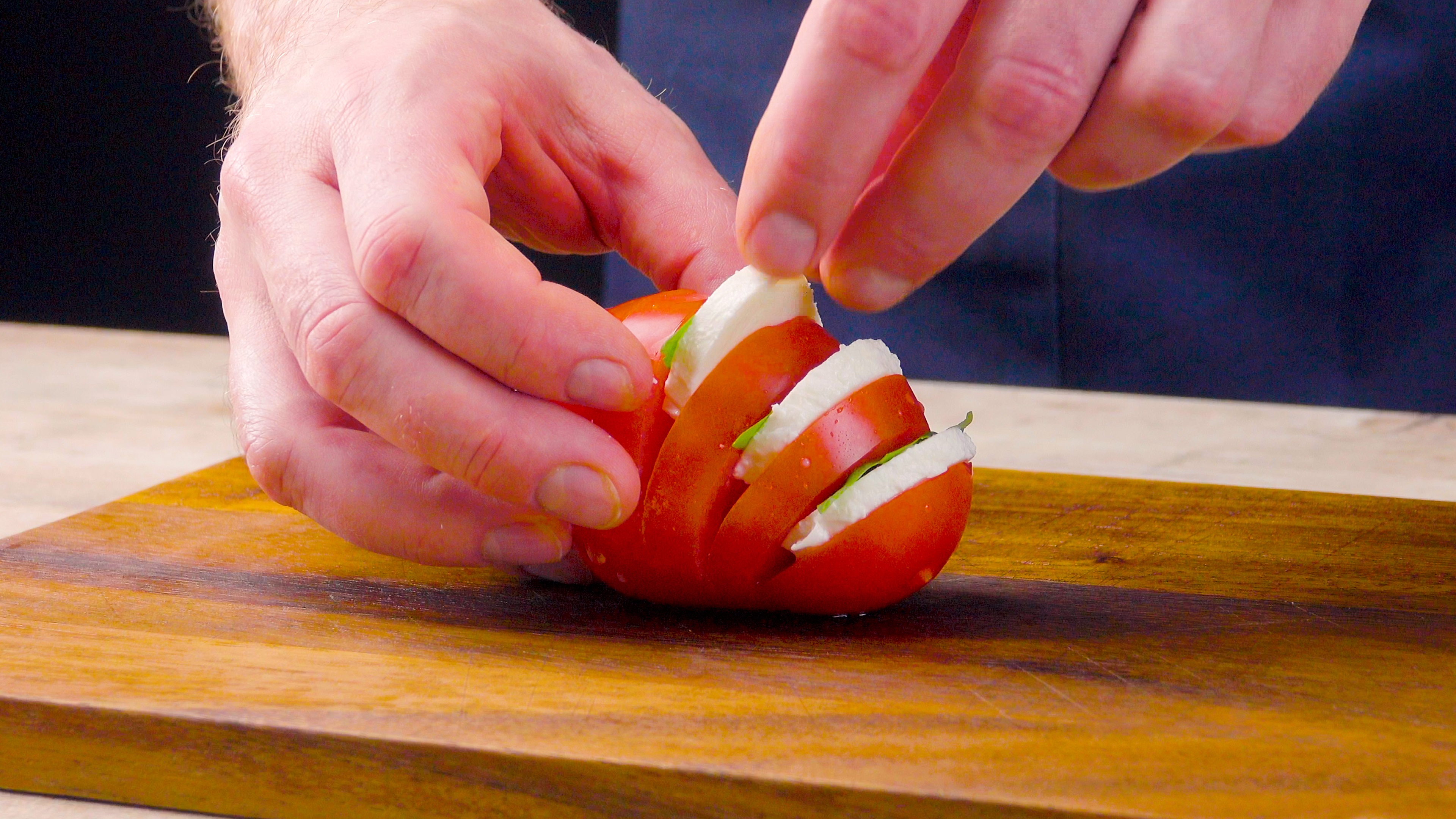 3.) Richte die übrigen zwei Tomaten auf – der Strunk zeigt dabei nach unten – und schneide eine schmale Scheibe von den Seiten. Auf diese Schnittfläche werden die Tomaten nun gelegt und rollen nicht mehr weg. Dann schneidest du auch in die Tomaten vier tiefe Spalten, in welche du je eine Scheibe Mozzarella und ein Basilikumblatt legst. Schließlich würzt du die Tomaten mit Salz und Pfeffer und beträufelst sie mit etwas Olivenöl und Balsamico.