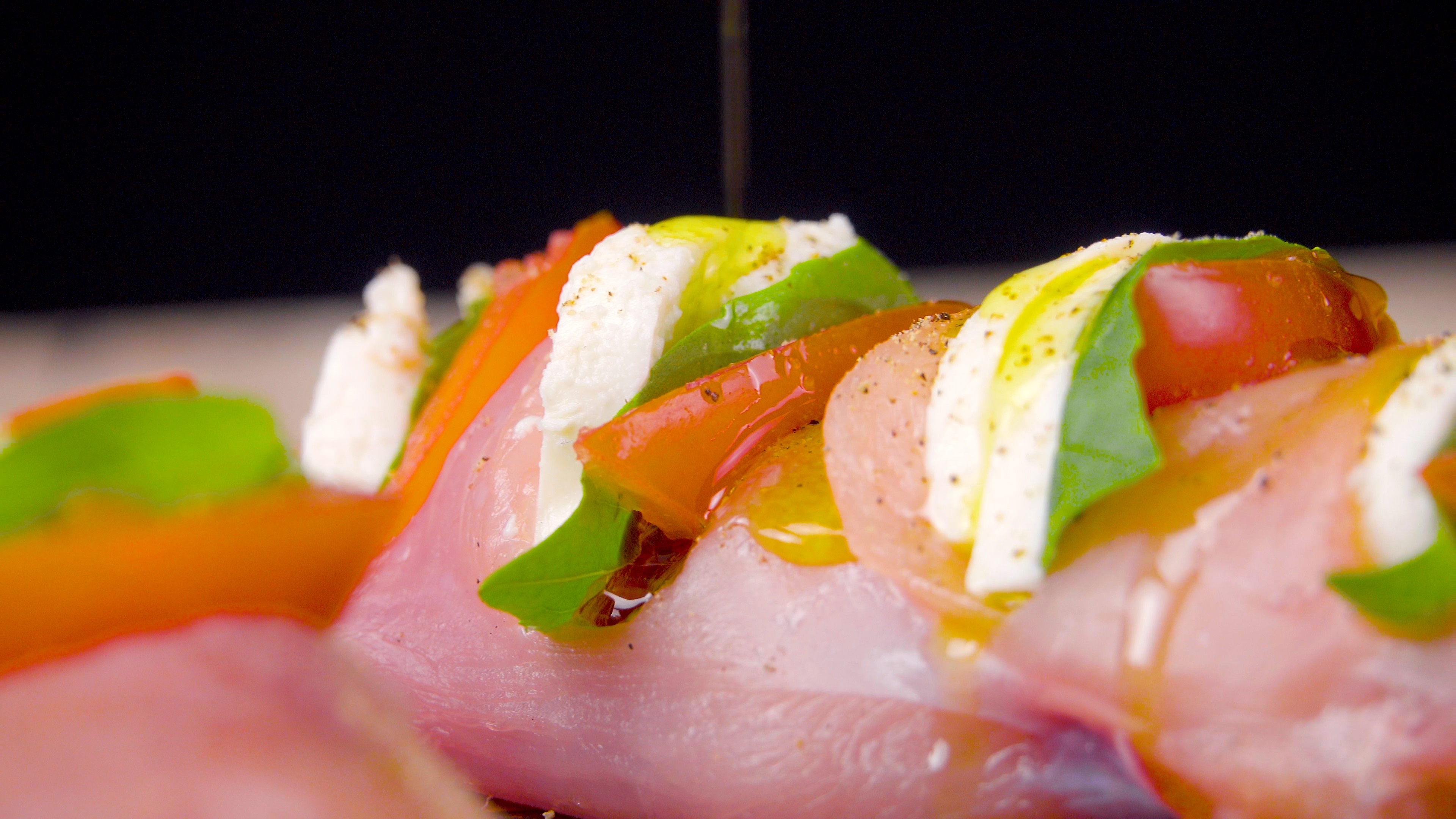 Als leichte Vorspeise, als Evergreen aller Partybuffets und als italienischer Importschlager ist Caprese-Salat so gern gesehen wie Omas Geldgeschenke an Weihnachten. Nicht nur farblich harmonieren Tomate, Mozzarella und Basilikum perfekt, der flotte Dreier scheint auch geschmacklich eine vom Schicksal vorbestimmte Kombination zu sein. Dennoch wagen wir es und erweitern die „Heiligen Drei“ um eine Geflügelzulage. Dafür brauchst du (für 2 Portionen):
