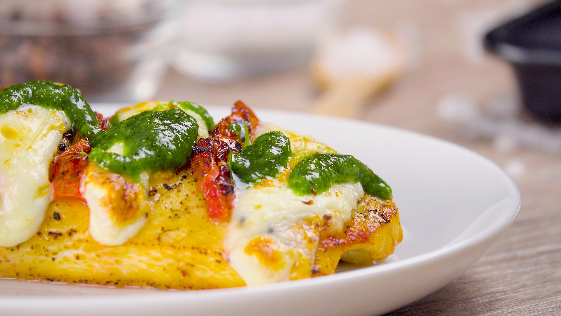 4.) Serviere die angerichteten Tomaten mit den Hähnchenbrüsten. Etwas Pesto ergänzt die Mahlzeit perfekt.