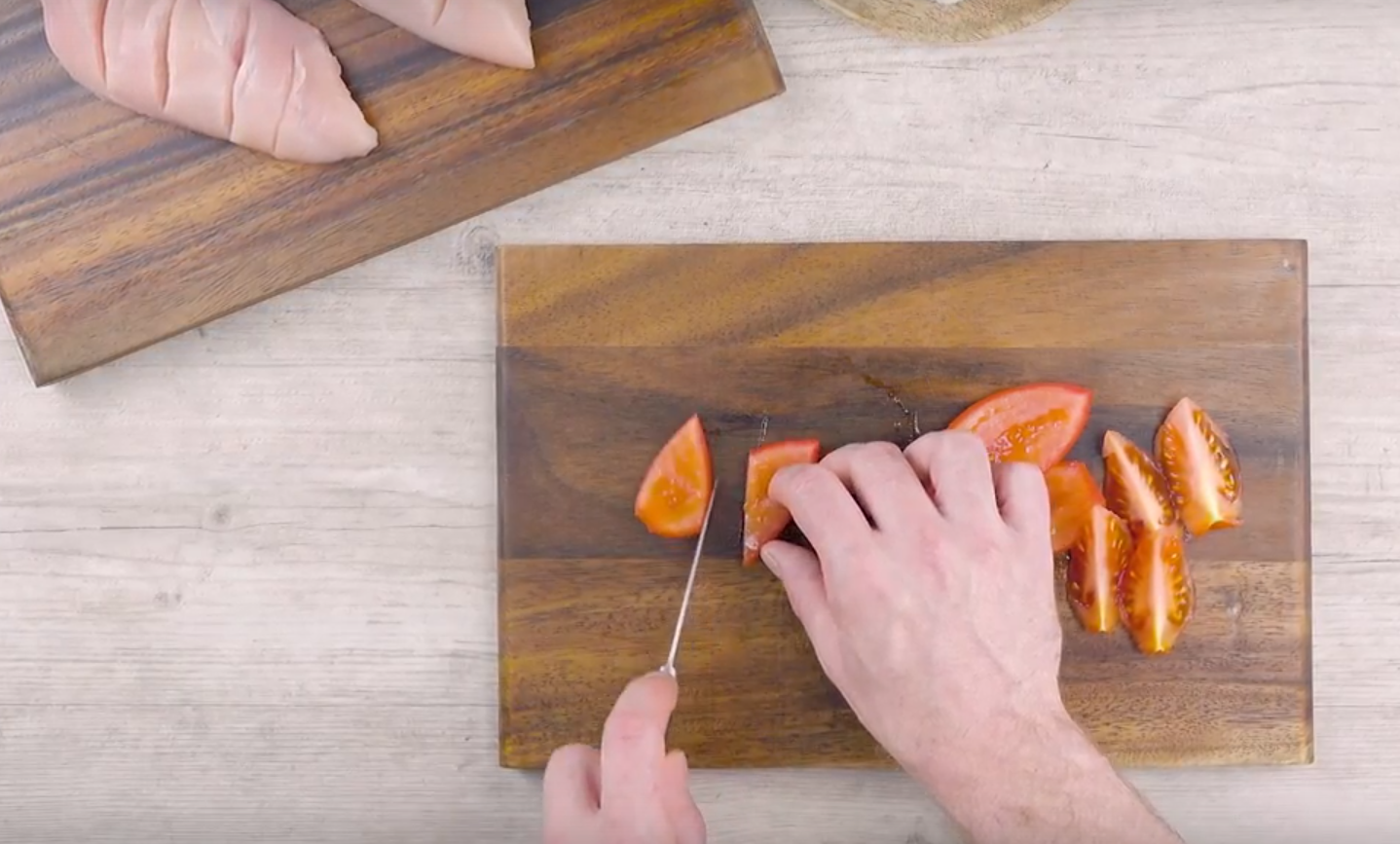So geht es: 1.) Schneide je vier tiefe Spalten in die Hähnchenbrüste. Halbiere die Mozzarella-Kugeln und schneide die Hälften in Scheiben. Schneide eine Tomate in Viertel. Entferne das Kerngehäuse und halbiere die Viertel.