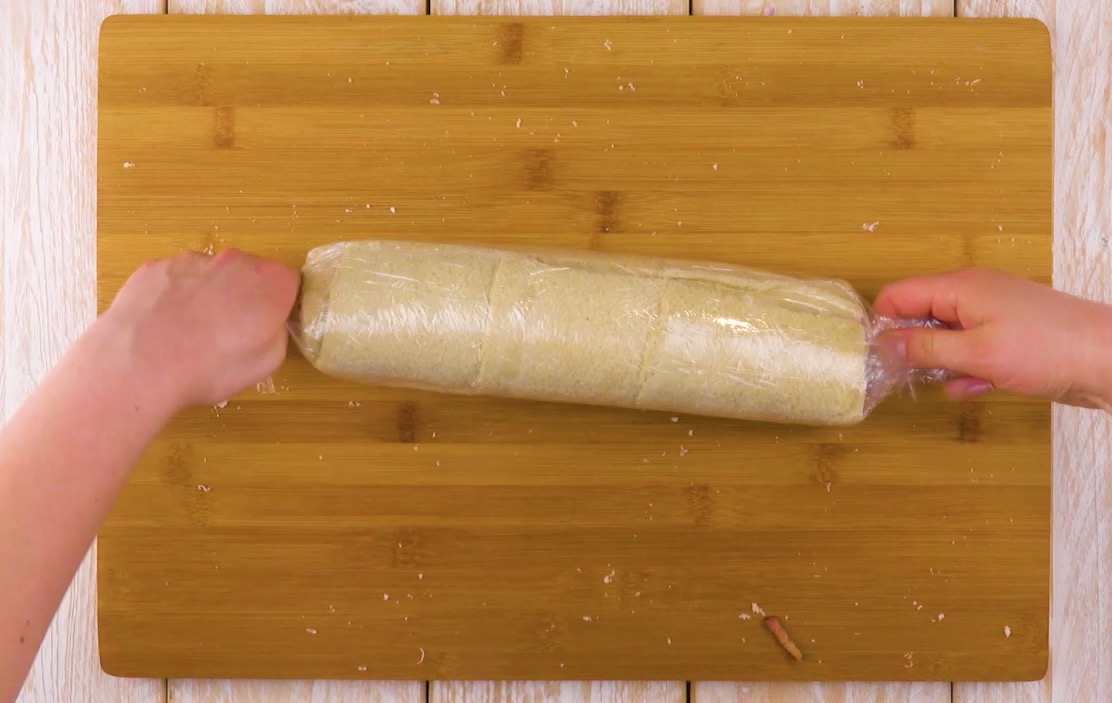 3.) Rolle die belegte Toastbrotplatte nun ein und packe sie in Frischhaltefolie. Die Enden kannst du wie bei einem Bonbon eindrehen. Damit bleibt die Rolle kompakt und nichts fällt heraus. Stelle sie etwa 30 Minuten kalt.