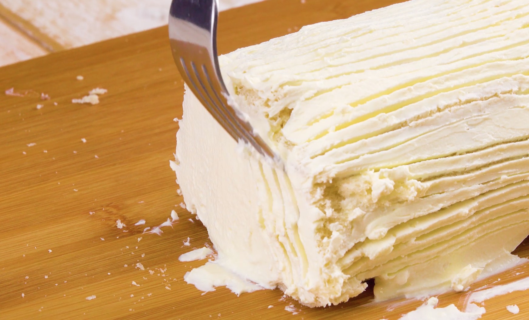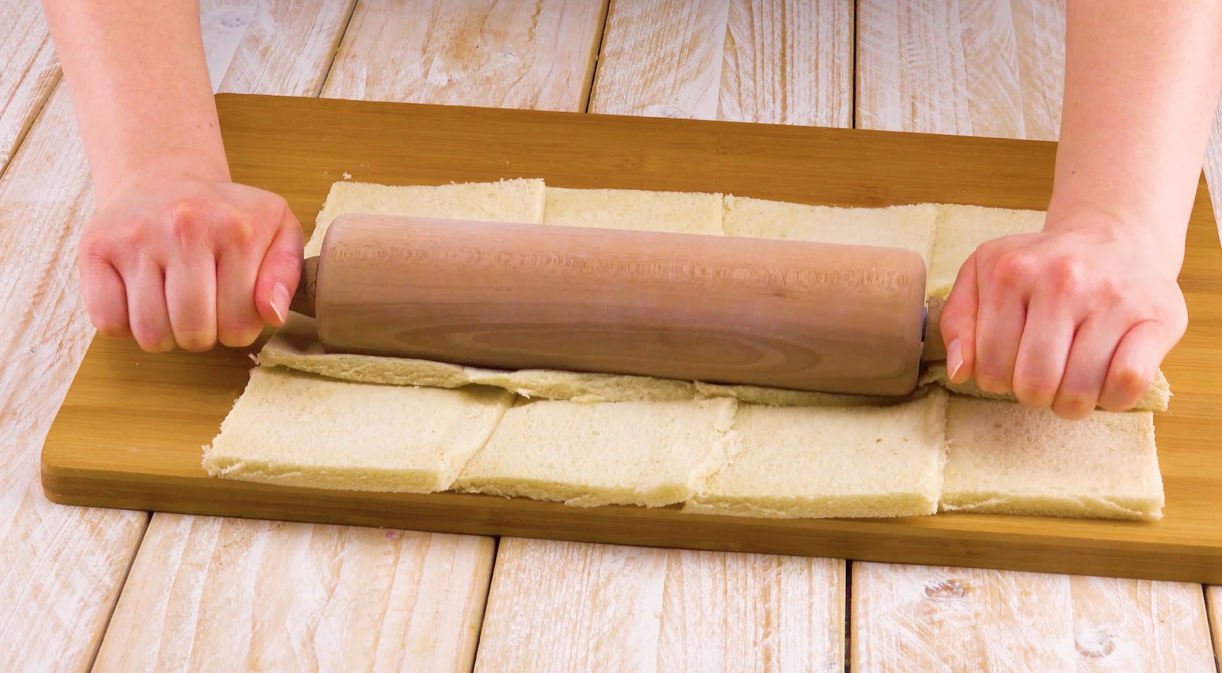 1.) Schneide für die Rolle zunächst die Kanten der Toasts ab und lege sie in einem Rechteck (am besten im Verhältnis 3 zu 4) leicht überlappend auf deine Arbeitsfläche. Walze sie mit einem Nudelholz platt und bestreiche die gesamte Fläche gleichmäßig mit Crème fraîche.