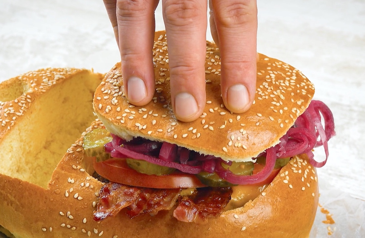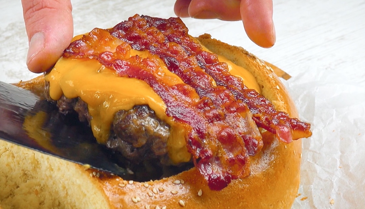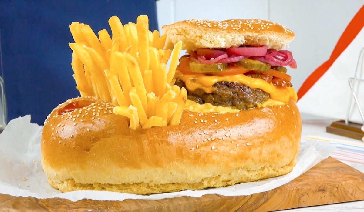 Dieser saftige Cheeseburger mit knackigen Pommes im XXL-Burger-Bun ist einfach zuzubereiten und damit die perfekte Fast-Food-Kreation für zu Hause.