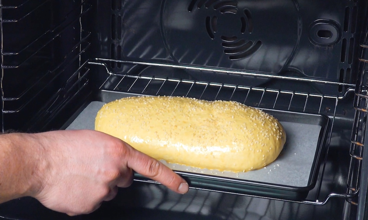 3. Knete den Teig nochmals durch und forme ihn zu einem großen Brötchen; lass dieses 10 Minuten ruhen, bevor es mit einem verquirlten Ei eingestrichen sowie mit Sesam bestreut wird. Backe den großen Burger-Bun dann für 25 Minuten bei 190 °C Ober-/Unterhitze goldbraun. Lass ihn anschließend abkühlen.