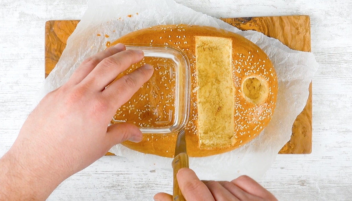 4. Höhle aus einer Hälfte des großen Burger-Buns ein Rechteck aus, hebe den Deckel davon für später auf. Höhle aus der anderen Hälfte wiederum ein schmales Rechteck sowie einen Kreis aus.