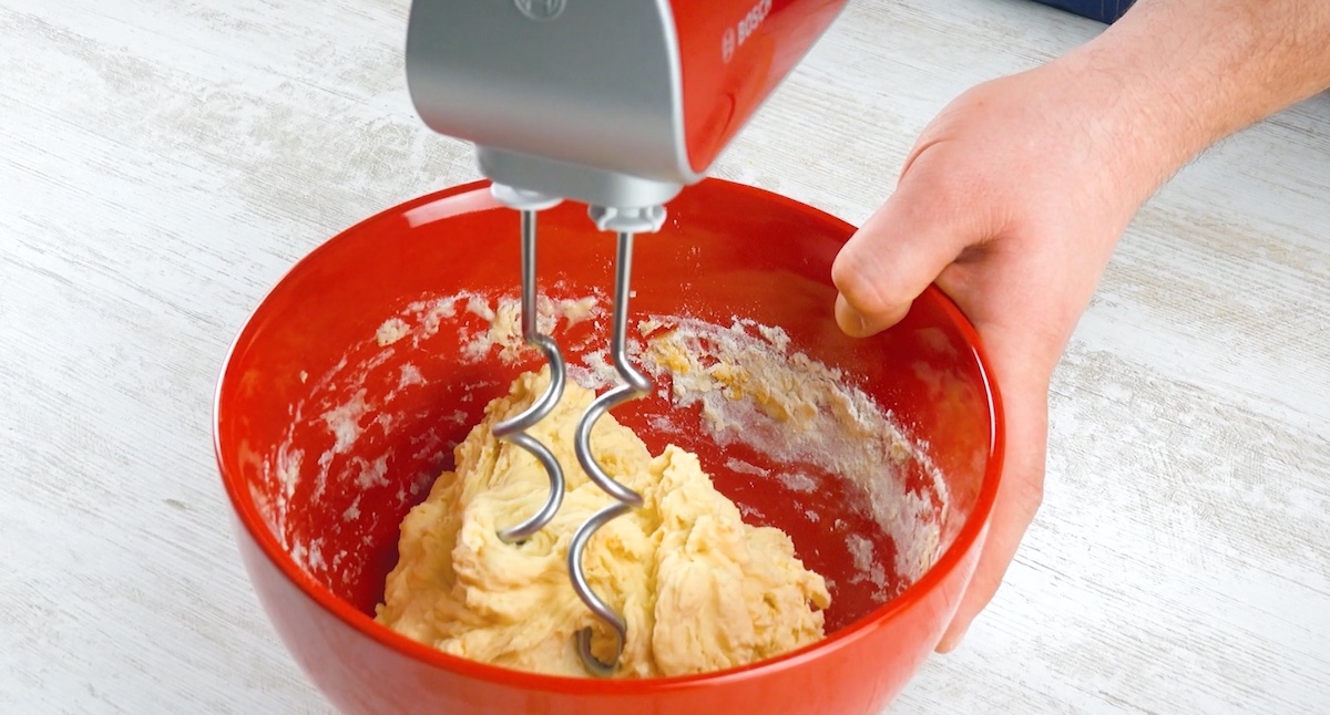 2. Löse für den Burger-Bun zunächst die frische Hefe in lauwarmer Milch auf. Gib Mehl, Ei, Butter, Salz und Zucker in eine große Schale, gieße dann die Hefemilch hinzu und verknete die Zutaten zu einem geschmeidigen Teig; lass diesen anschließend für 1 Stunde abgedeckt ruhen.